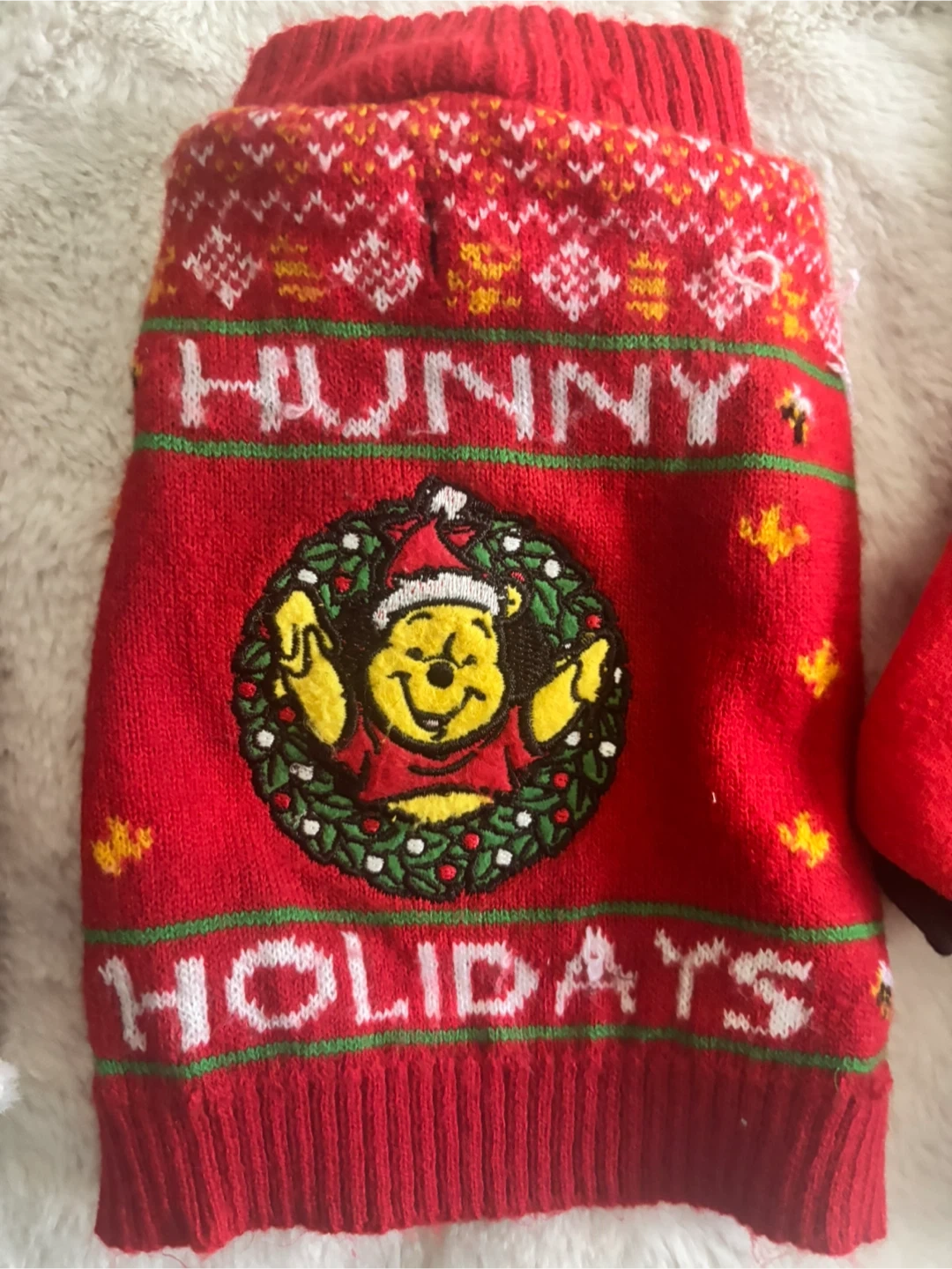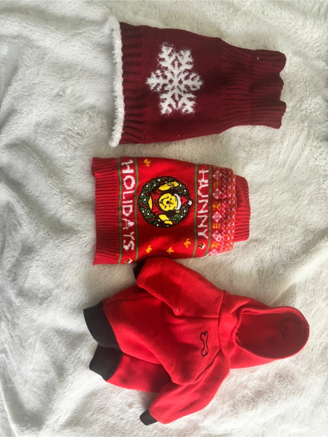 Selling a set of dog sweaters and a hoodie. The sweaters are red with festive designs, and the hoodie is also red with a bone detail. Perfect for keeping your furry friend warm and stylish! Size XS