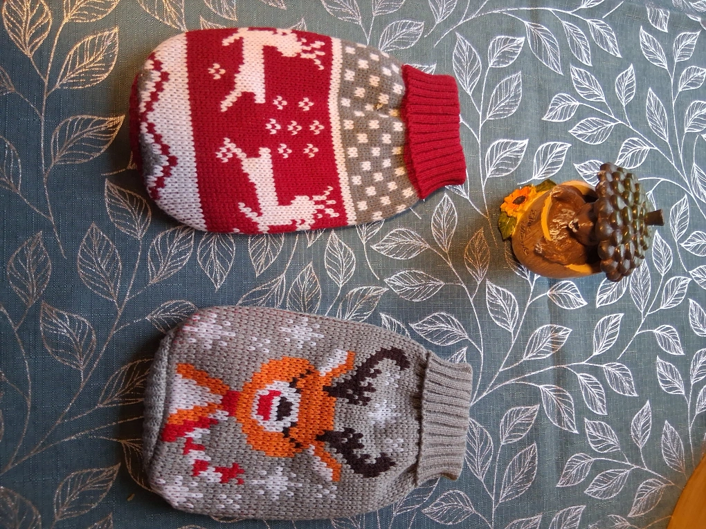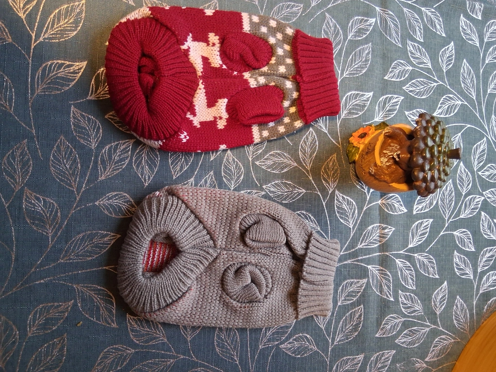 10Two cute dog/cat sweaters! One is red and white with reindeer, and the other is grey with a reindeer design. They're both knitted and ready to keep your furry friend warm and stylish during the colder months. Sweaters will fit kitten or very small dog. The price is for 1 sweater