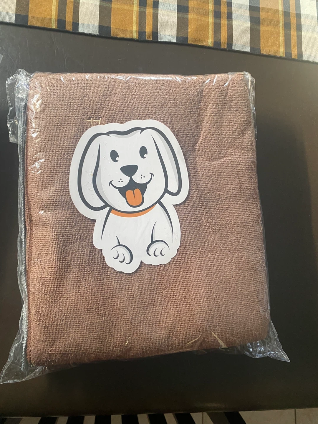 Brand new dog towel still in its original packaging! The towel is a soft brown colour with a cute dog graphic on it. Perfect for drying off your furry friend after a bath or a walk in the rain