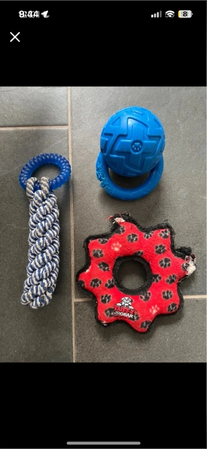 165Selling a set of dog toys! Includes a blue ball, a rope toy, and a red gear-shaped toy. They're in used condition.