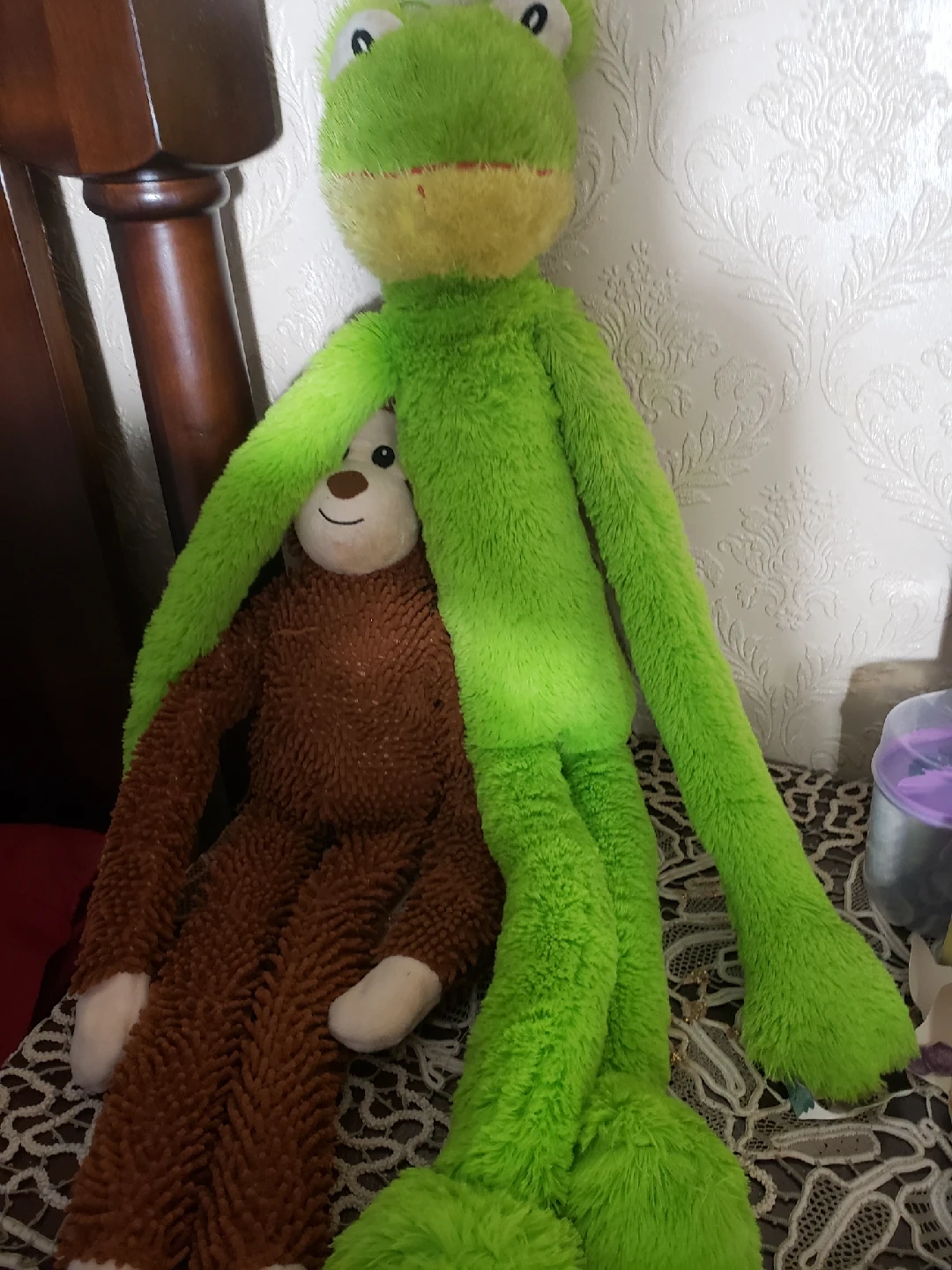 Selling dog toys, a plush chicken leg and a stuffed monkey and frog. They're in good condition and ready for a new home!