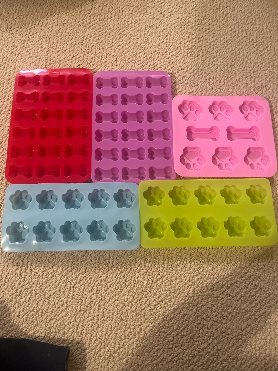 Fun silicone molds for making dog treats! There are five molds in total, featuring bone and paw print shapes. They come in red, purple, pink, blue, and green. Perfect for making homemade goodies for your furry friend
