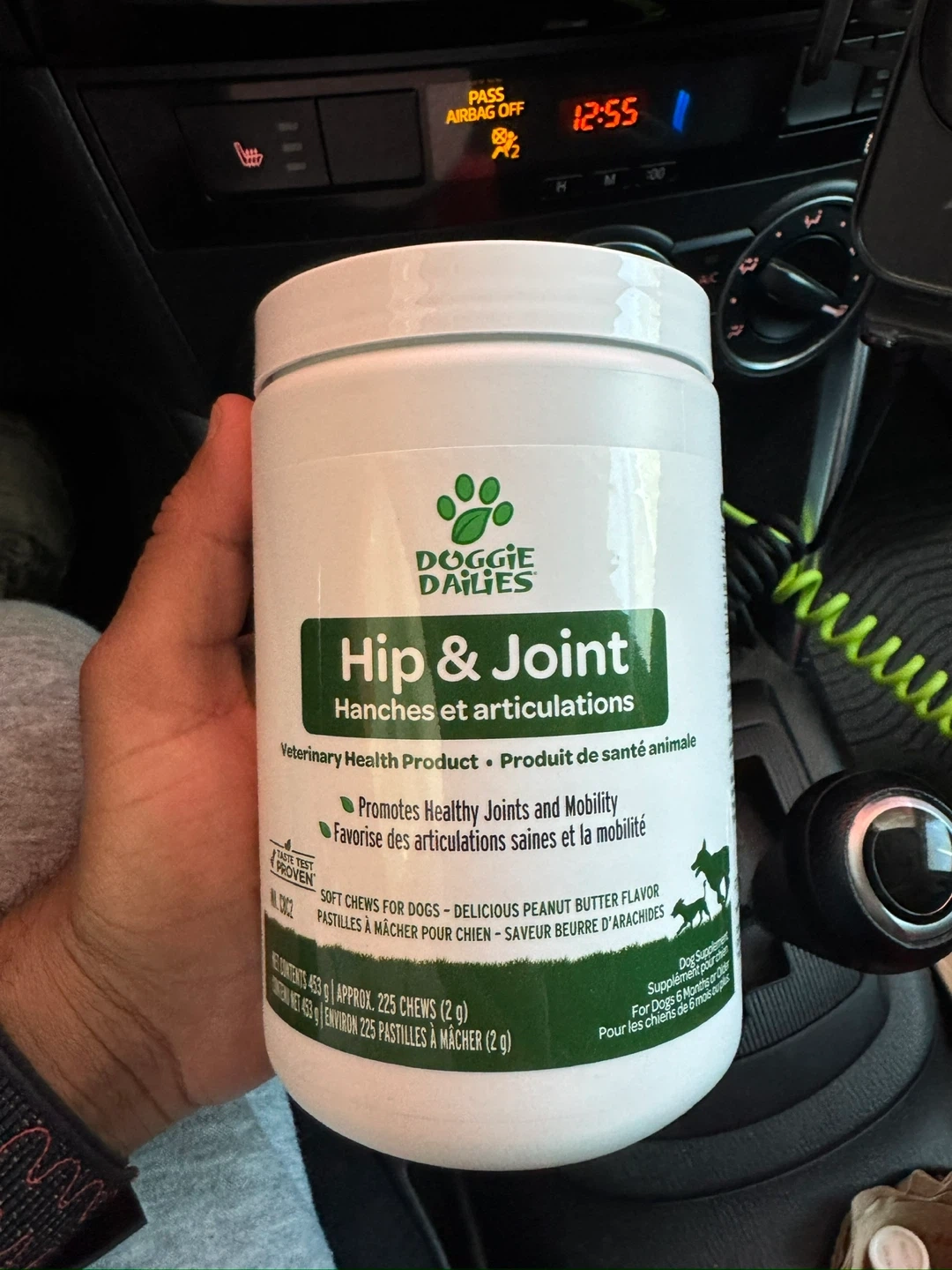 20Here's a jar of Doggie Dailies Hip & Joint supplement for your furry friend! It promotes healthy joints and mobility with a delicious peanut butter flavour that dogs love. The expiration date is February 2027.