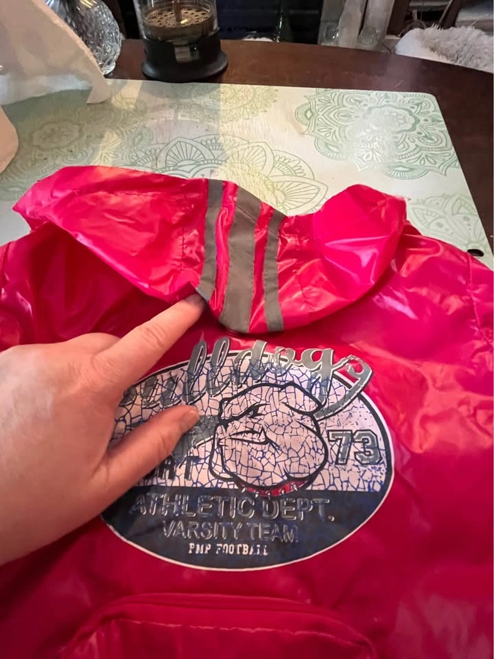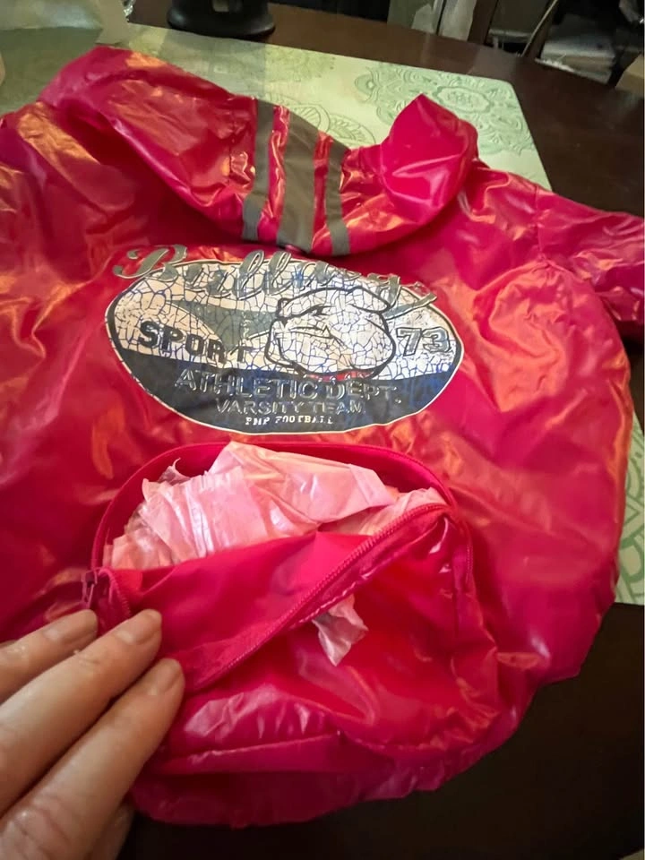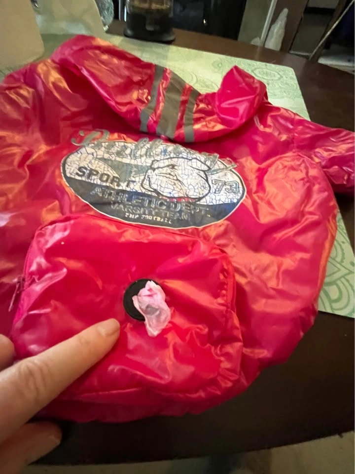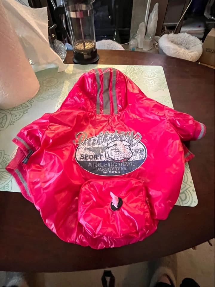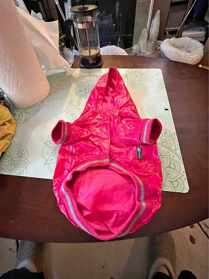 Doggy Nylon Rain Jacket size: Medium Features: Easy on & off design Hood with snap closure for when not in use so it doesn’t get in the way. Zipper pouch for doggydoo bags with easy access opening . Opening slit for leash Velcro closure I’m located in East Cloverdale near 188 th Street and 64 avenue in Surrey.