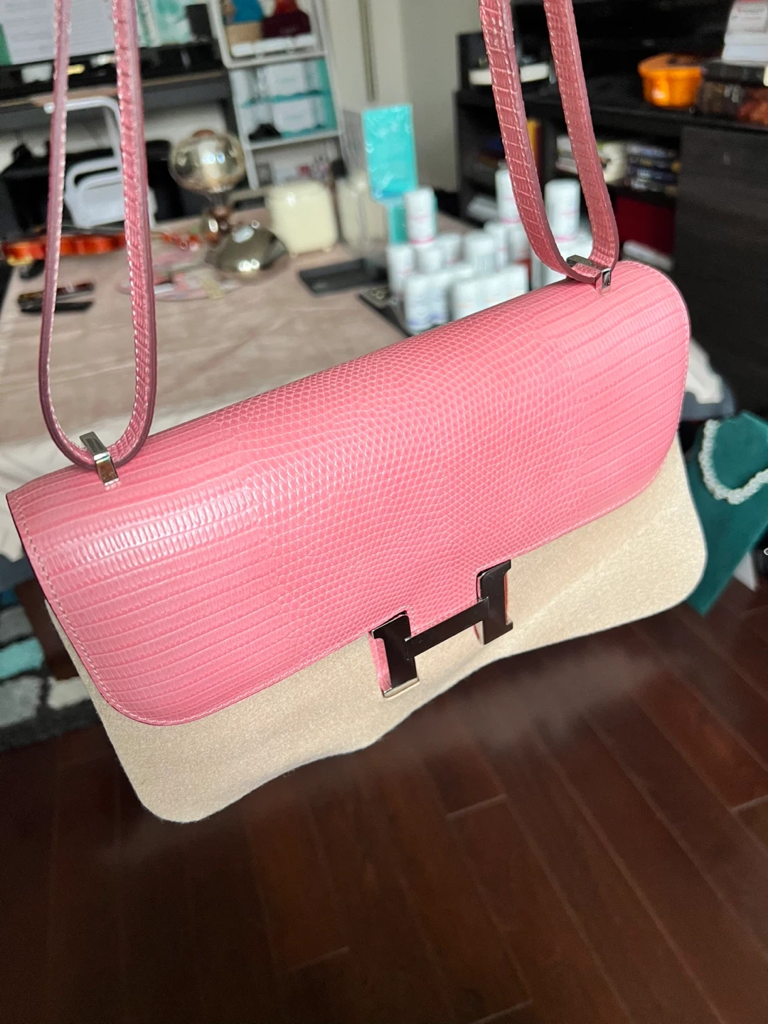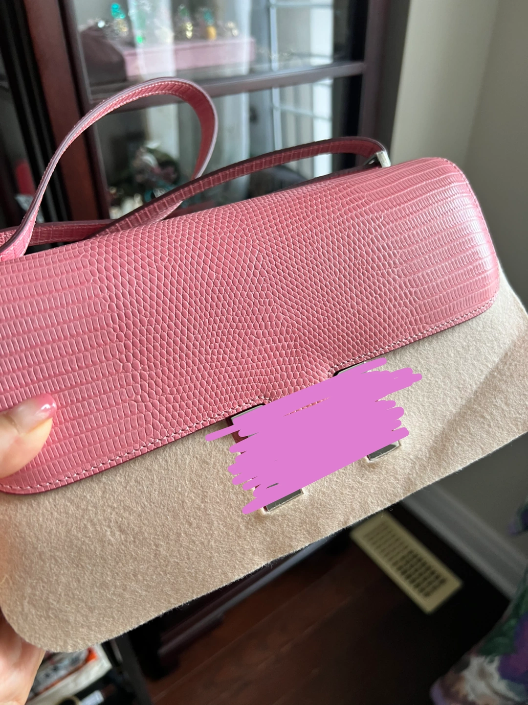 shoulder bag featuring a pink lizard exterior with a suede flap. It has a silver 'H' clasp closure and a single shoulder strap. Bag's interior is visible in one shot.