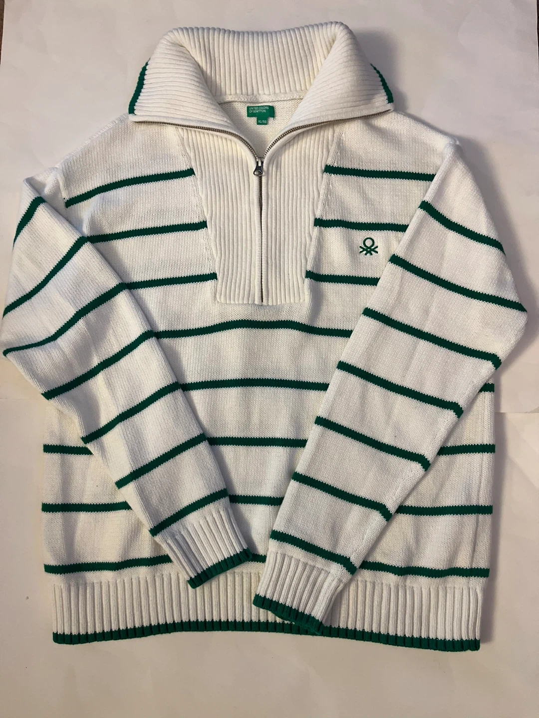 A white and green striped quarter zip sweater from United Colors of Benetton. It's a size XL/TG. This knit sweater features a zippered neck and ribbed cuffs and hem.