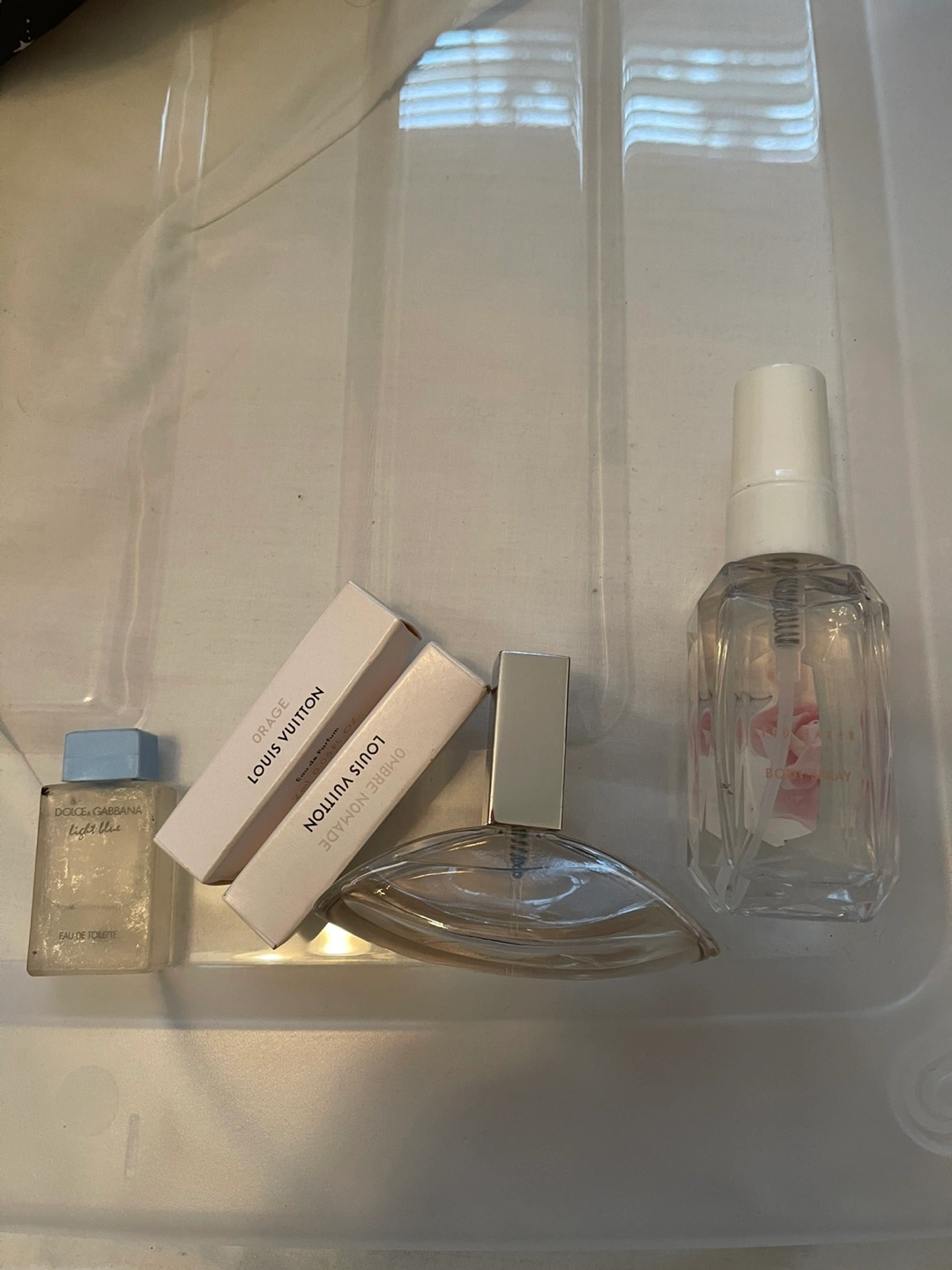 Selling a few different perfumes, including Dolce & Gabbana Light Blue, Louis Vuitton Orage, and Louis Vuitton Ombre Nomade
