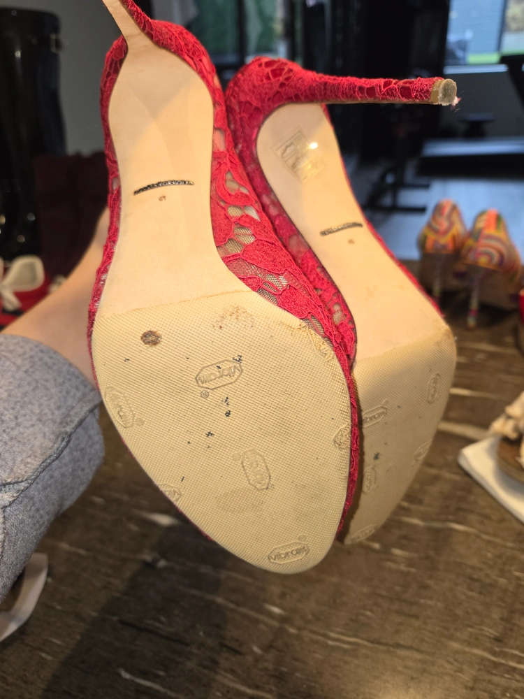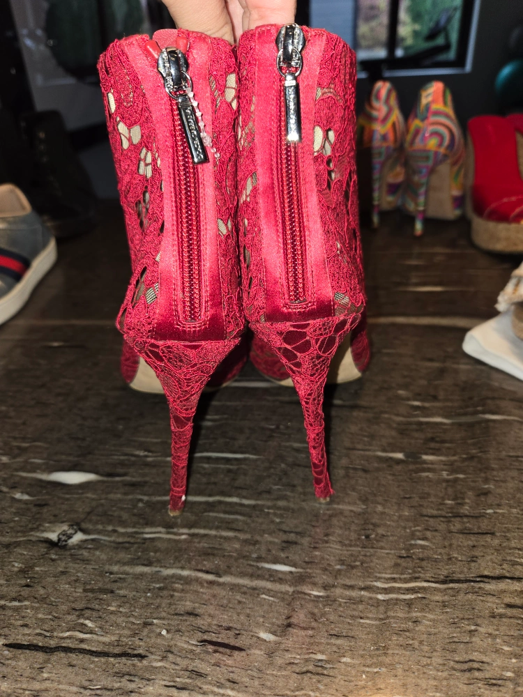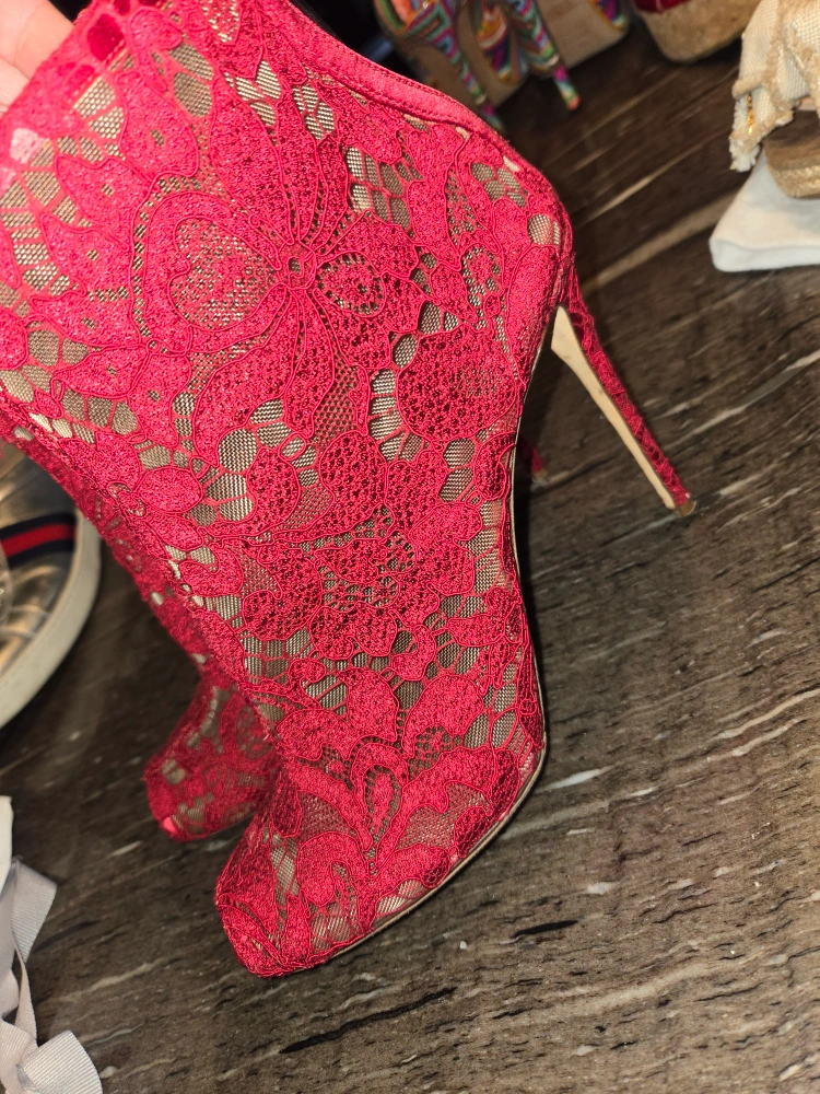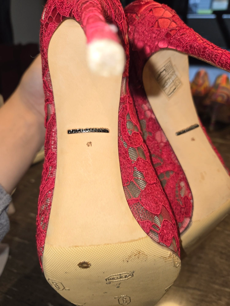 Selling a pair of Dolce & Gabbana red lace peep-toe booties. They are in used condition, as shown in the photos. The size is 41.
