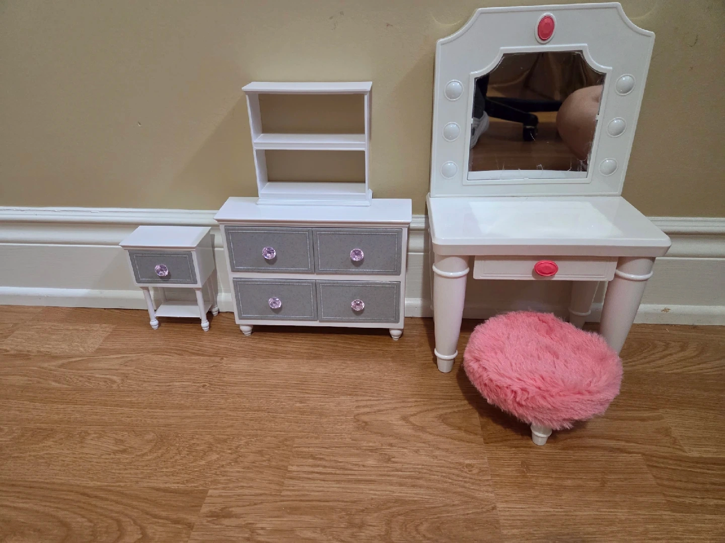 87Selling a cute doll vanity set! It includes a vanity table with a mirror, a dresser, a nightstand, and a fluffy stool. Great for any dollhouse or imaginative play!