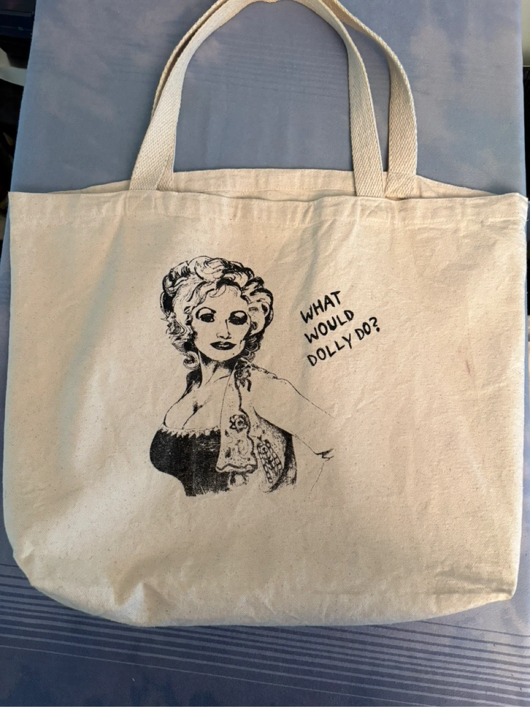 Tote bag featuring Dolly Parton and the line “What Would Dolly Do”. Bought in Tennessee. Larger than a square tote, fits a decent amount of stuff.