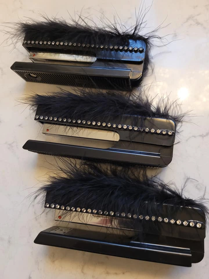 151/ ICE SCRAPERS **Swarovski rhinestone - x12 $5.00 each 2/. APRONS** Velvet, feather & satin ribbon ties - X2. $20.00 each 3/ STAPLERS**Feather & Rhinestone x3 $8.00 each 4/ LEATHER CASE** handbag lined zipper X2 $15.00 each