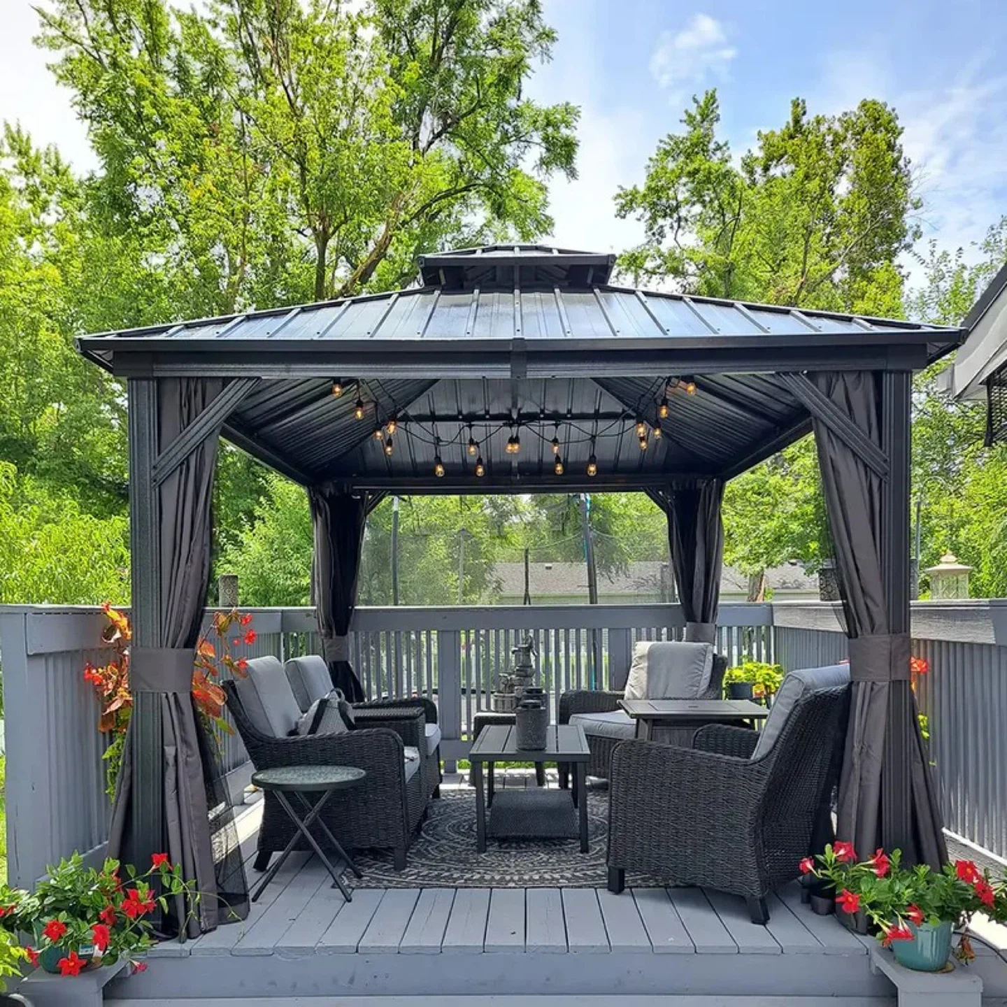 60Domi Hardtop Gazebo 10x12FT, Aluminum Outdoor Gazebo with Galvanized Steel Double Roof Canopy, Curtains and Netting Included, Metal Gazebo Permanent Pavilion for Patio, Lawn, Garden, Gray