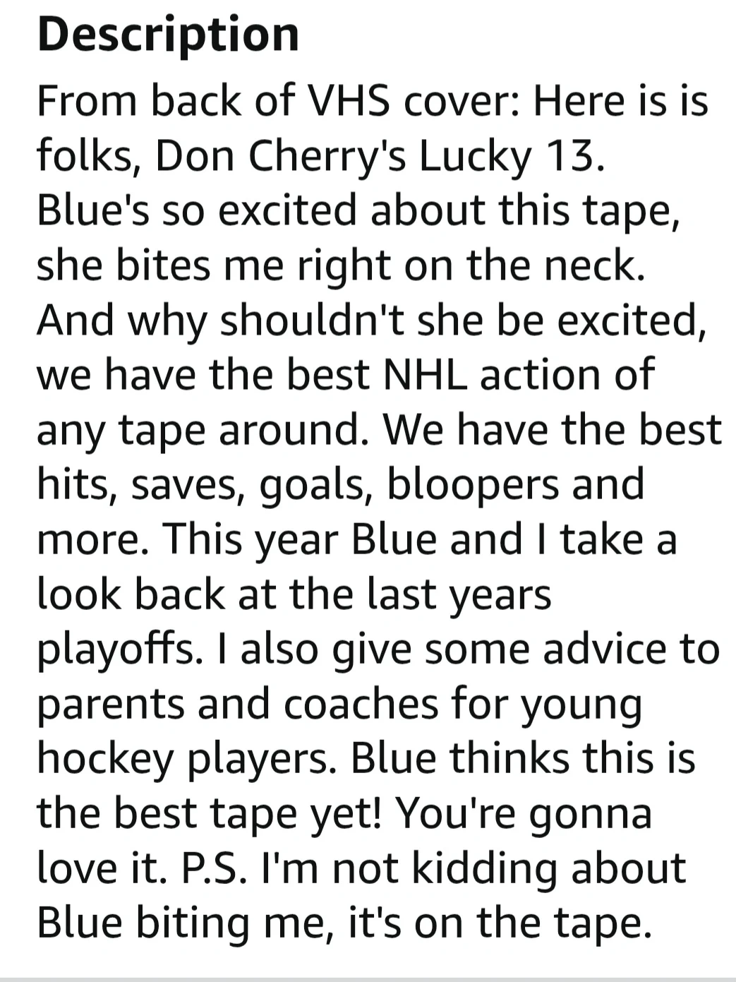214Sealed Selling a Don Cherry's Lucky 13 VHS tape! It includes the best hits, saves, goals, bloopers, and more from the NHL. Plus, there's advice for parents and coaches of young hockey players. A must-have for any hockey fan! Pick up in south Pickering Bayly and Liverpool SEND YOUR MESSAGE WHEN YOU ARE READY TO PURCHASE