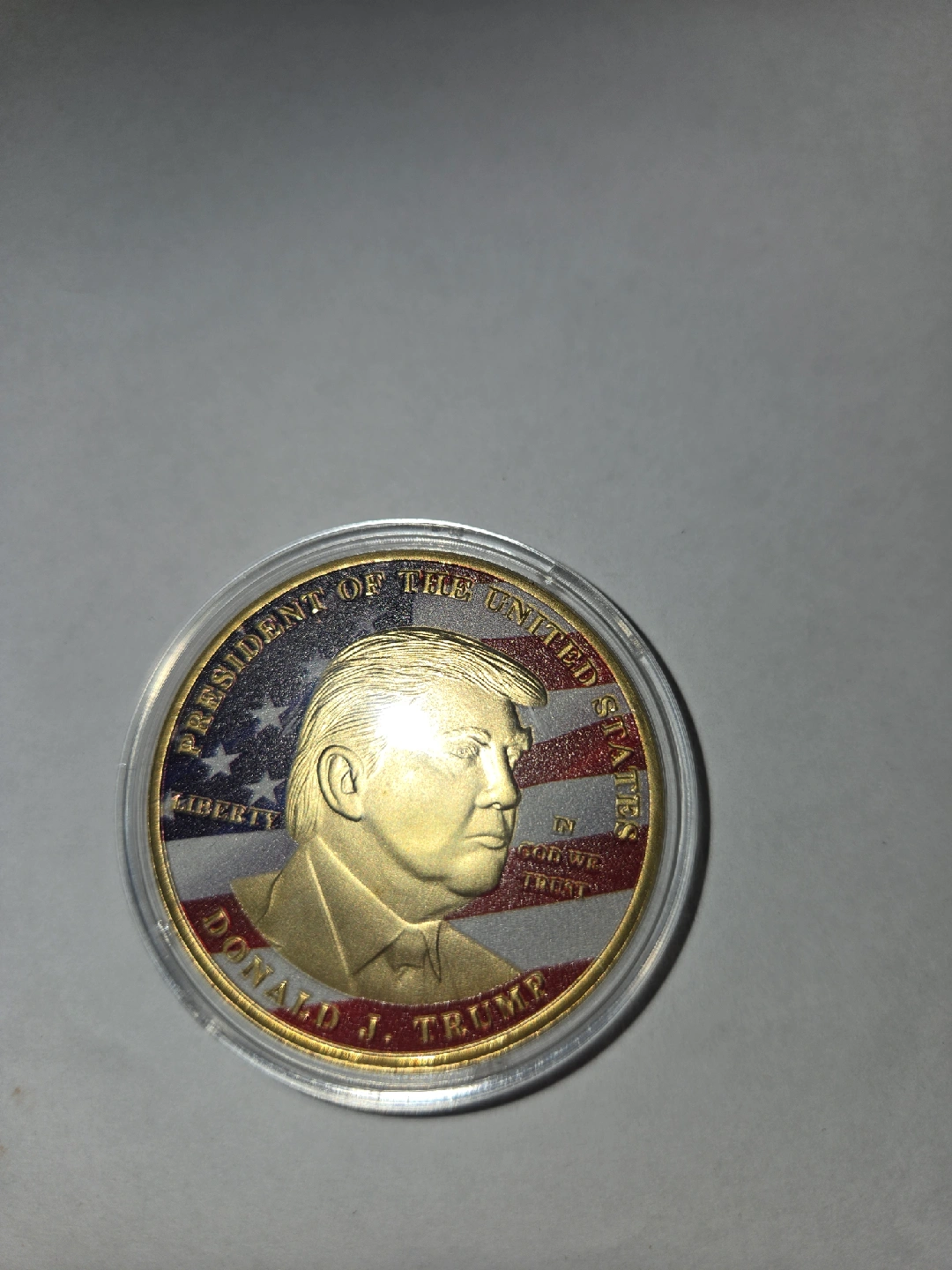 105Selling a Donald Trump commemorative coin. It features an eagle design on one side and a portrait of Donald Trump on the other. A neat collectible item!