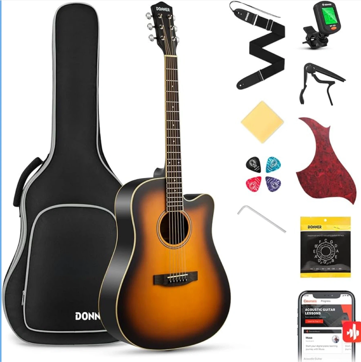 10Selling a Donner acoustic guitar bundle! This package comes with everything you need to get started, including a guitar case, strap, tuner, capo, picks, cloth, and even a pickguard. Brand new never used