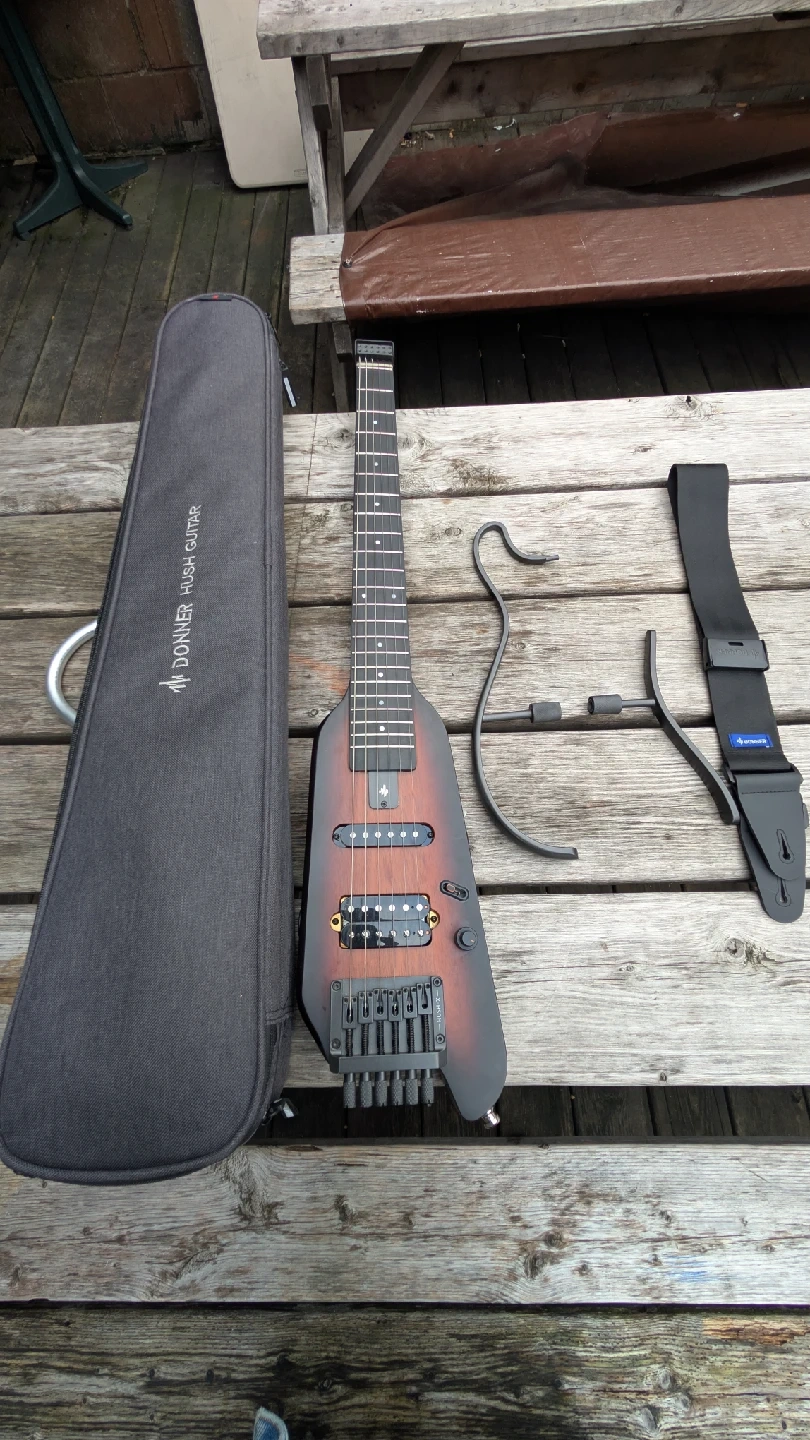 60Donner Hush Travel Guitar – Excellent condition, barely used! Super compact and quiet, perfect for practicing with headphones or taking on the go. Great tone and sustain. Comes with original Donner gig bag and accessories.