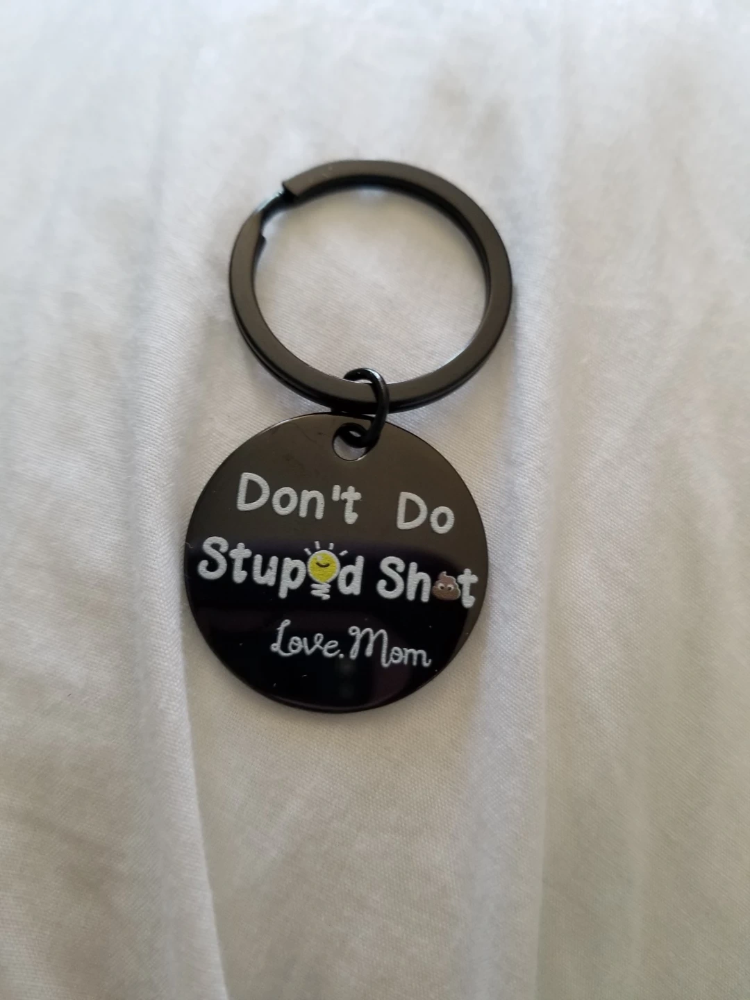 240A cute little keychain that says, "Don't Do Stupid Sh*t" with a lightbulb and poop emoji, signed "Love, Mom"! It's brand new and ready to go on your keys or backpack