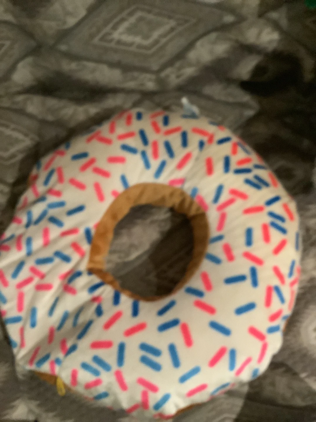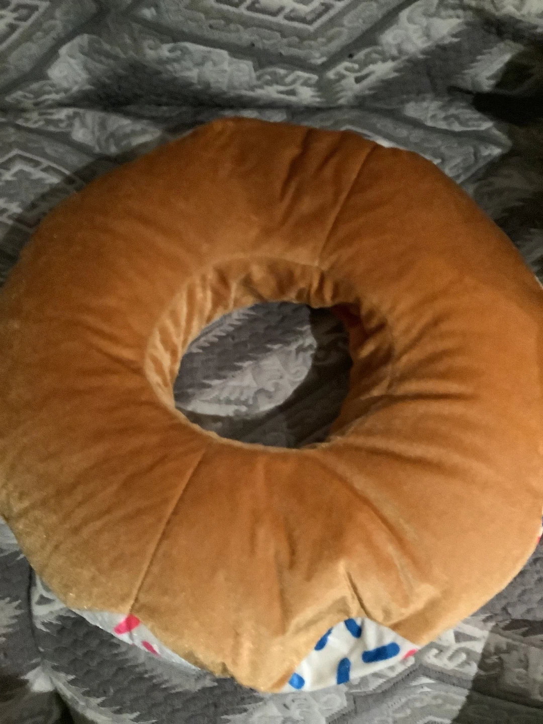 15A cute donut pillow! It has a white base with colourful sprinkles on one side and a brown base on the other
