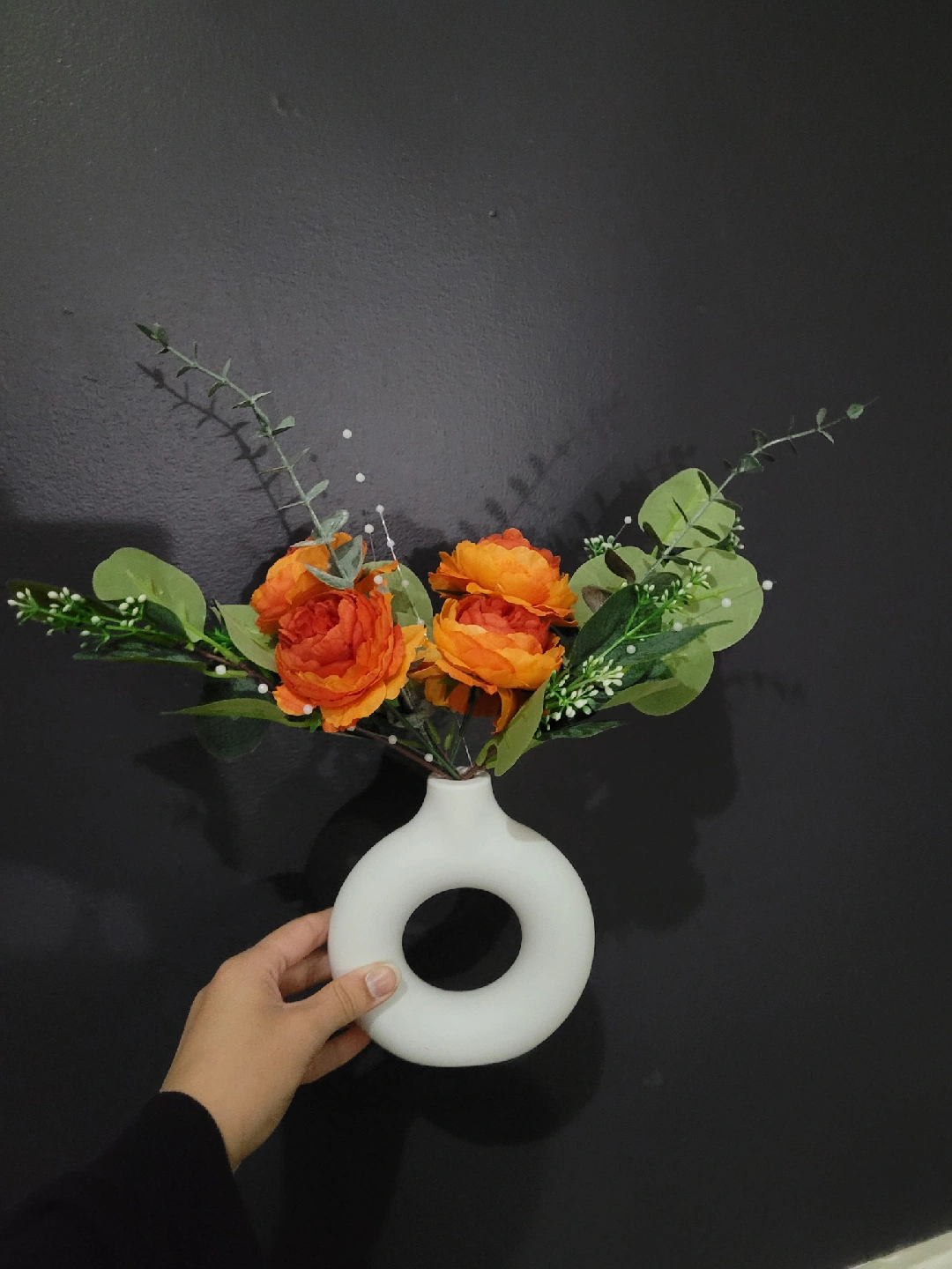 I'm selling a lovely donut-shaped vase with a beautiful arrangement of artificial orange flowers. It's perfect for adding a pop of colour to any room! The vase is in great condition and the flowers are realistically designed. It is a great piece for home decor and would look great on a table or shelf