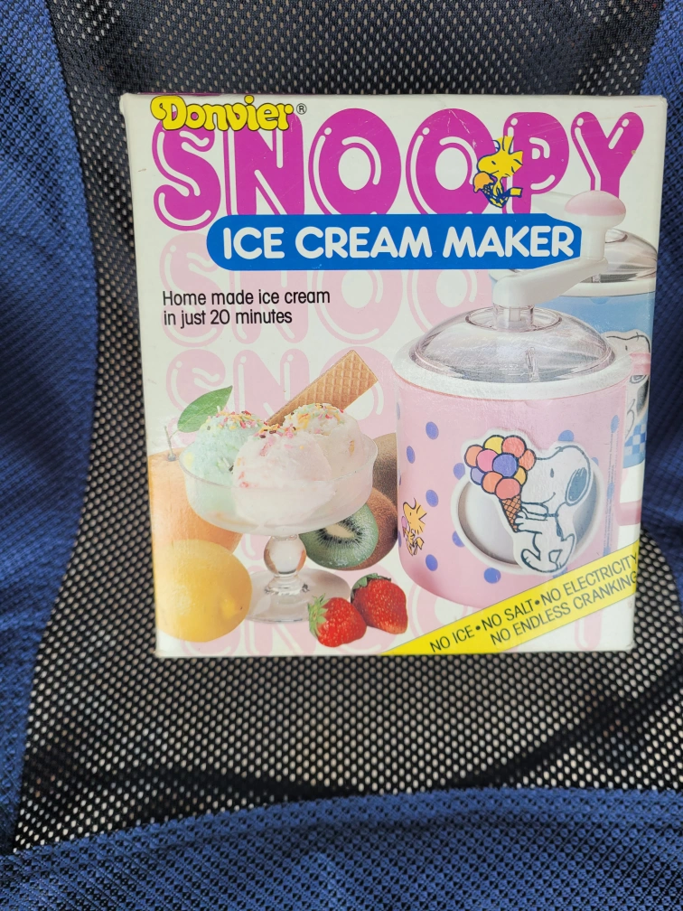 Get ready to make some delicious homemade ice cream in just 20 minutes with this Donvier Snoopy Ice Cream Maker! It's in like-new condition and comes with the original box. No ice, no salt, and no electricity needed – just endless cranking fun! Perfect for creating your own flavour combinations, this ice cream maker is easy to use and clean. It's a delightful way to share some fun with the family!