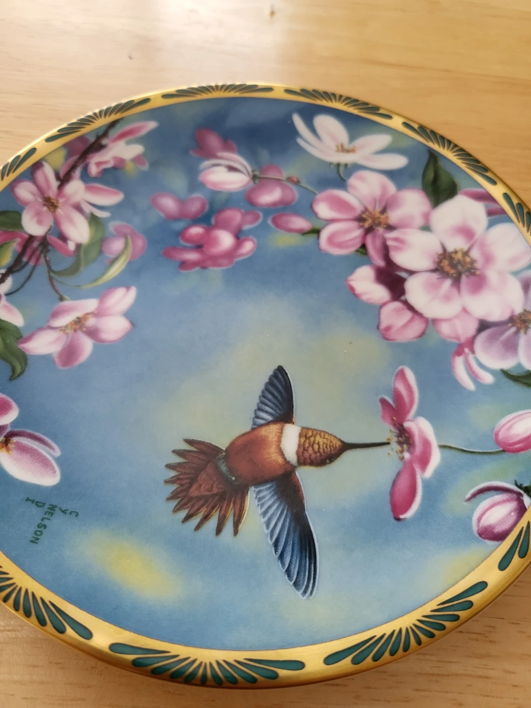 This is the second issue in the Gems of Nature: The Beautiful Hummingbirds series, "Profuse Hummingbird and Apple Blossoms" by Cyndi Nelson. It's a limited edition collector plate from Pickard, Inc. Note: Not safe for use with food; pigments may be toxic.