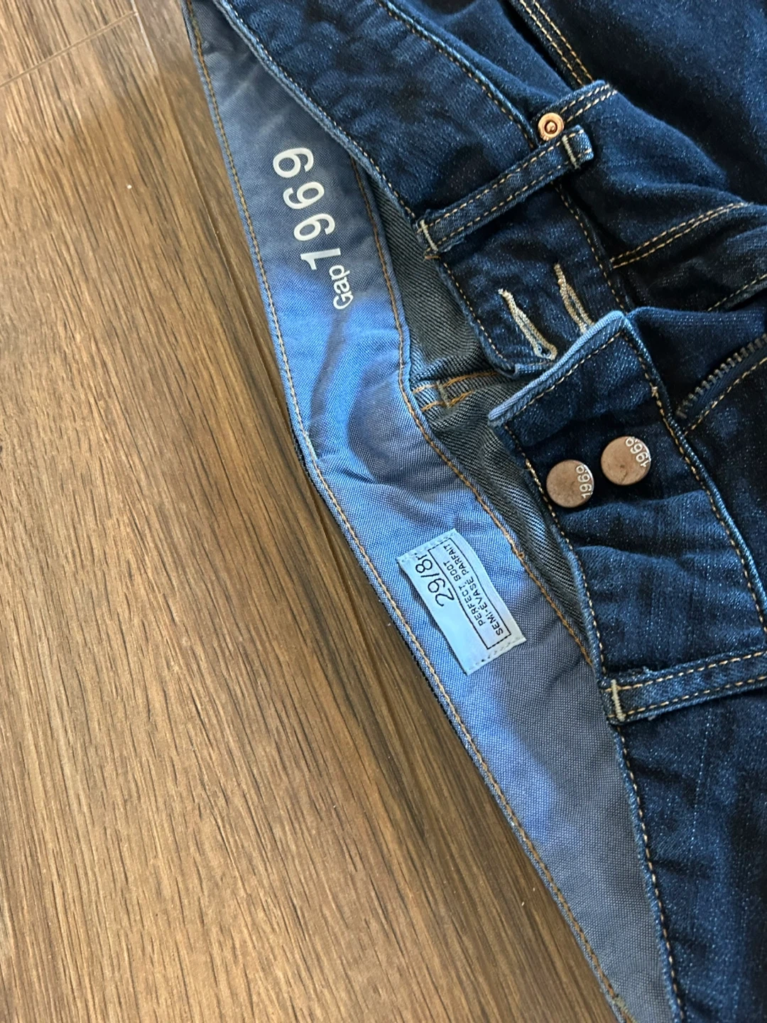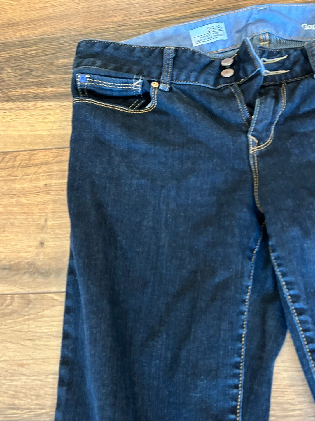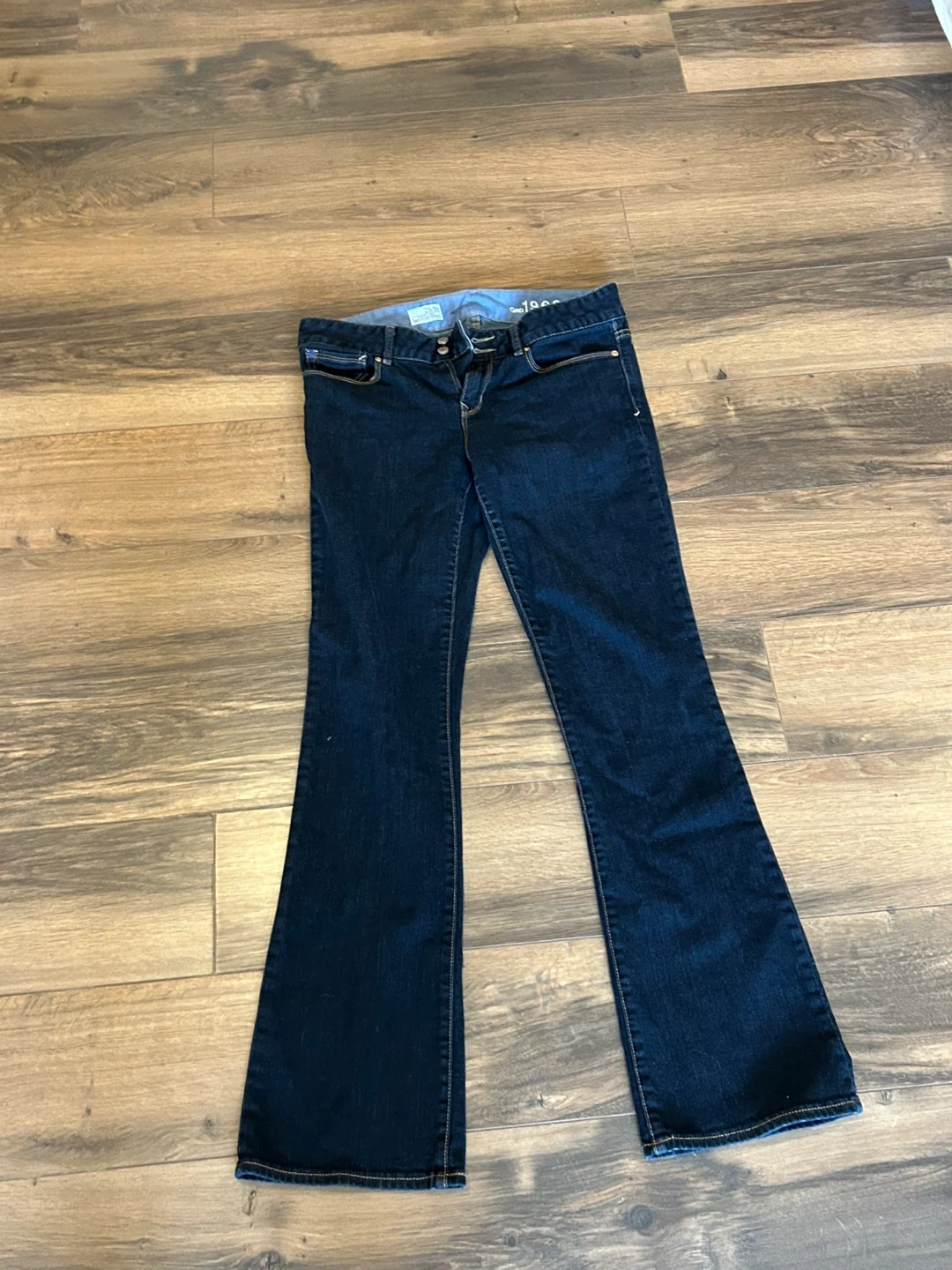 Women's dark wash bootcut jeans from Gap. Size is 29/8. They feature a classic five-pocket design with a button and zip fly closure. Comfortable denim material.