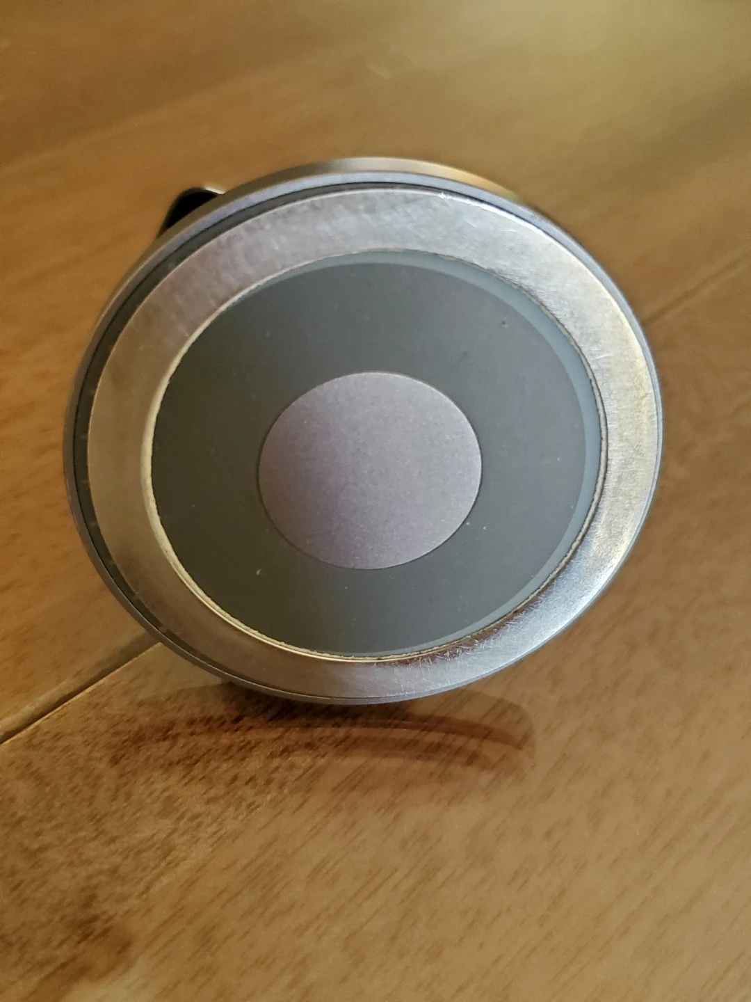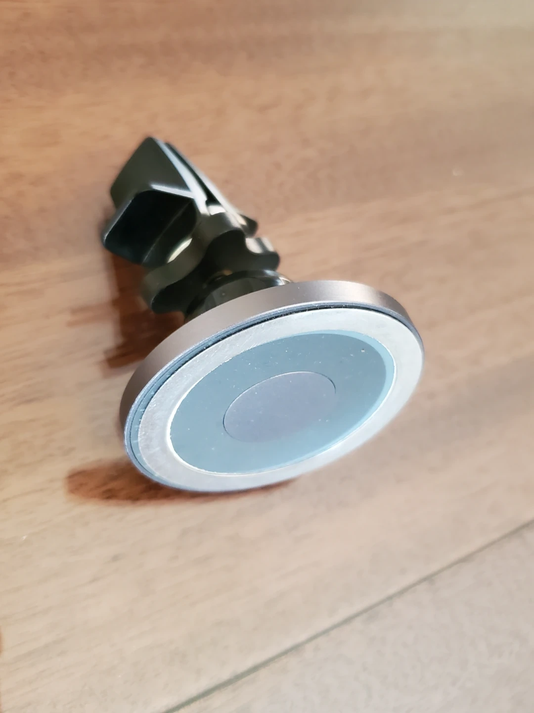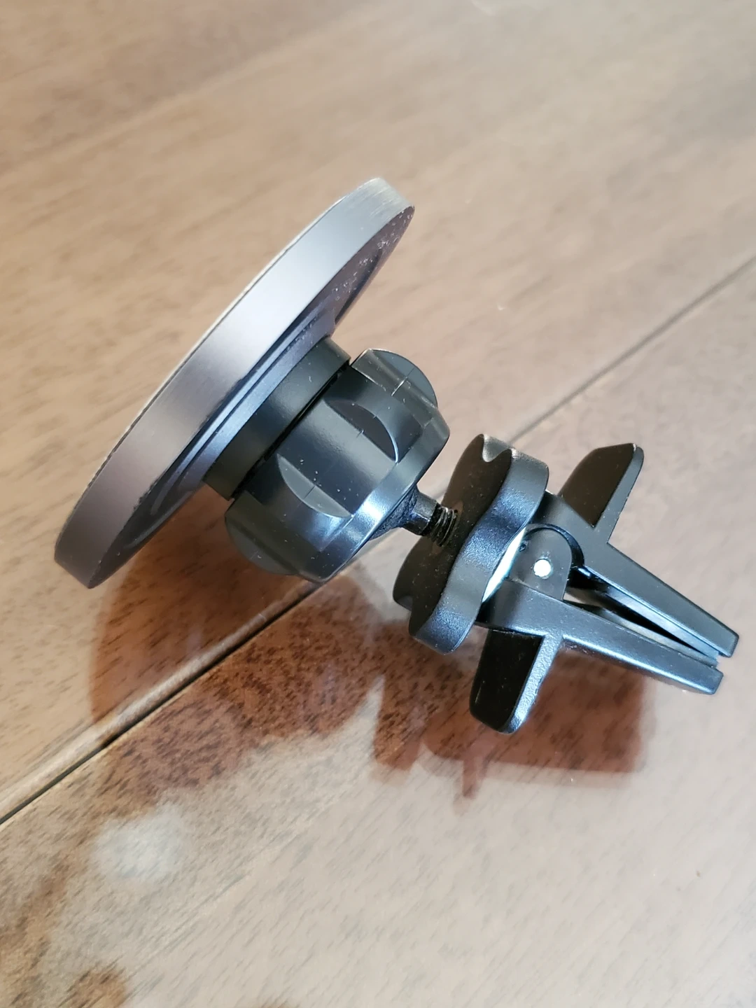 This magnetic car mount securely holds your phone on your car's air vent. It's made with durable metal and plastic components. Simply attach the metal plate to your phone or case, and it'll stick to the mount's magnet. This mount provides easy access to your phone while driving.