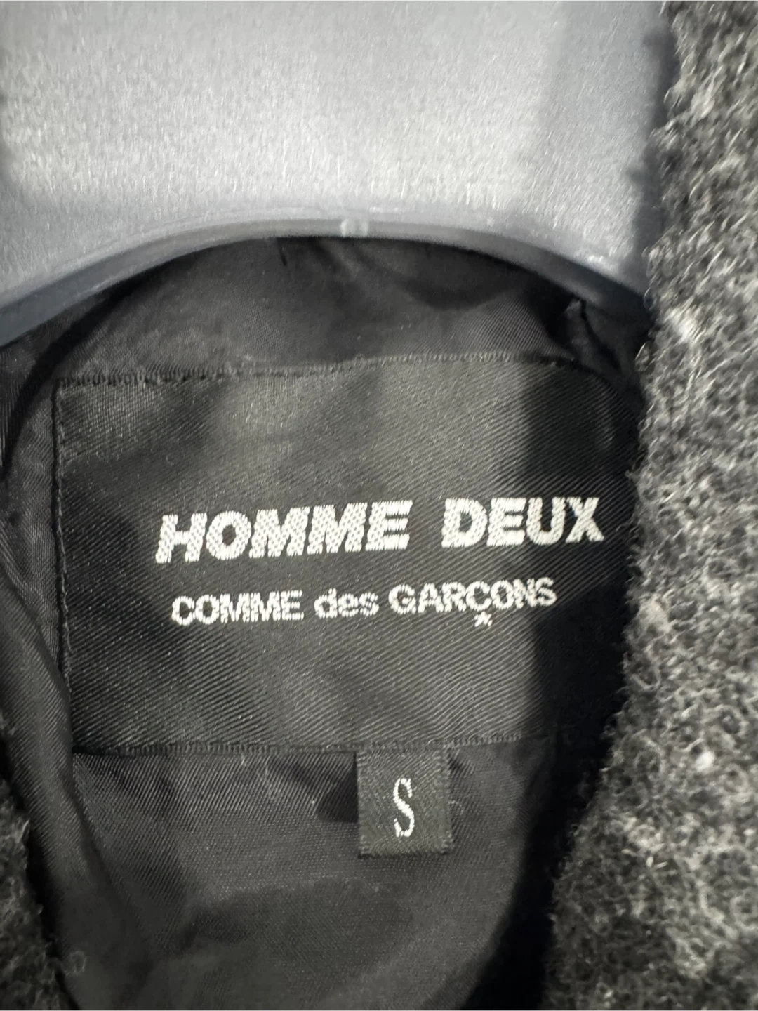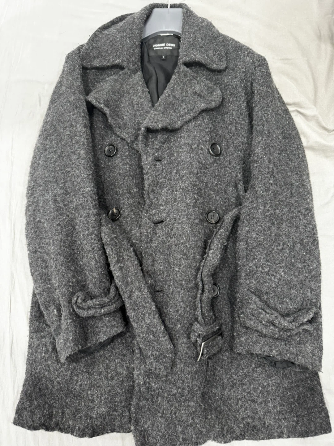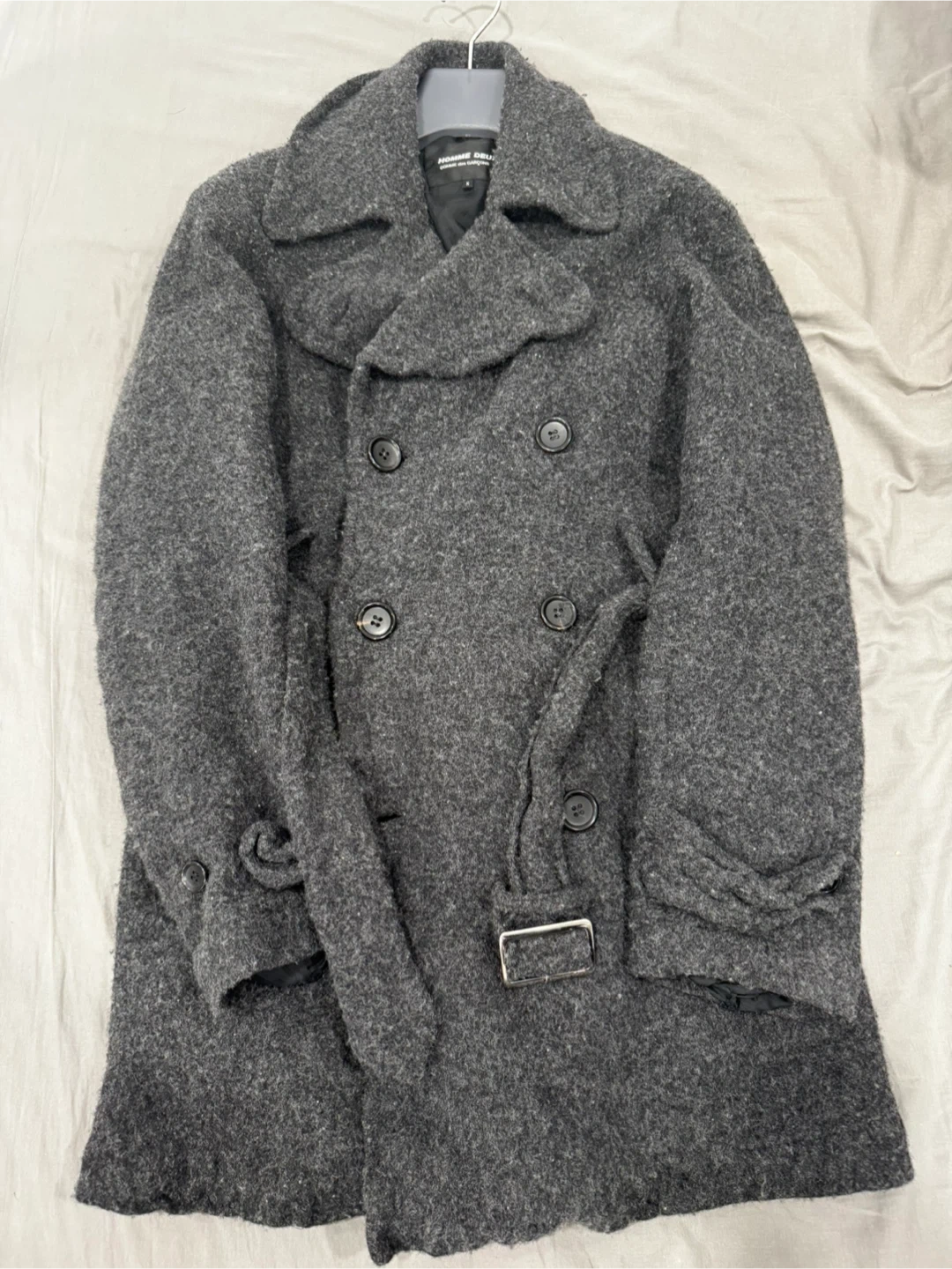 This is a Comme des Garçons Homme Deux double-breasted peacoat. It's made of a boiled wool material. The size is S.