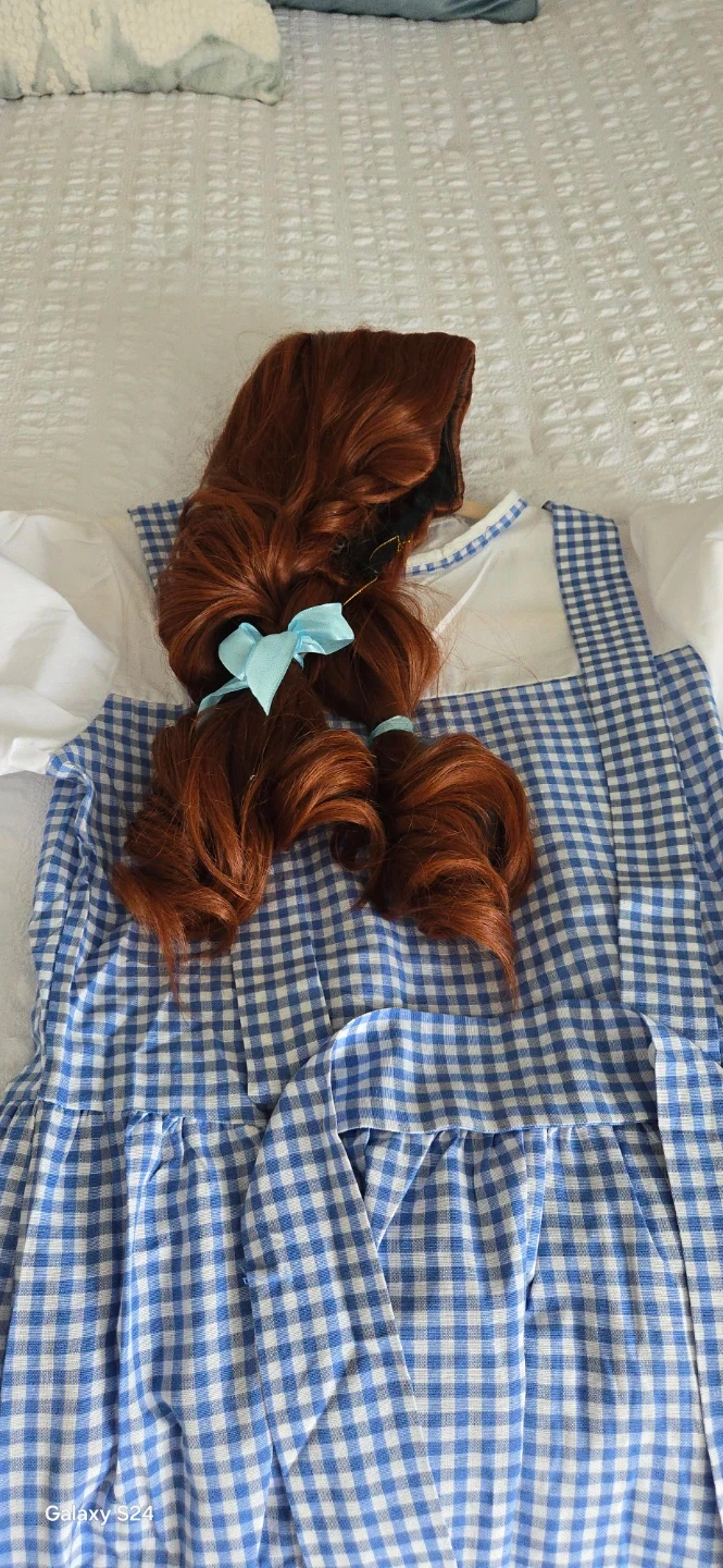 10Here's a cute Dorothy costume, complete with the iconic blue and white gingham dress and matching wig! It's perfect for Halloween, a costume party, or just playing dress-up. The dress has a classic design and is in great shape. The wig is styled in Dorothy's signature pigtails with light blue ribbons. A fun outfit for any Wizard of Oz fan!