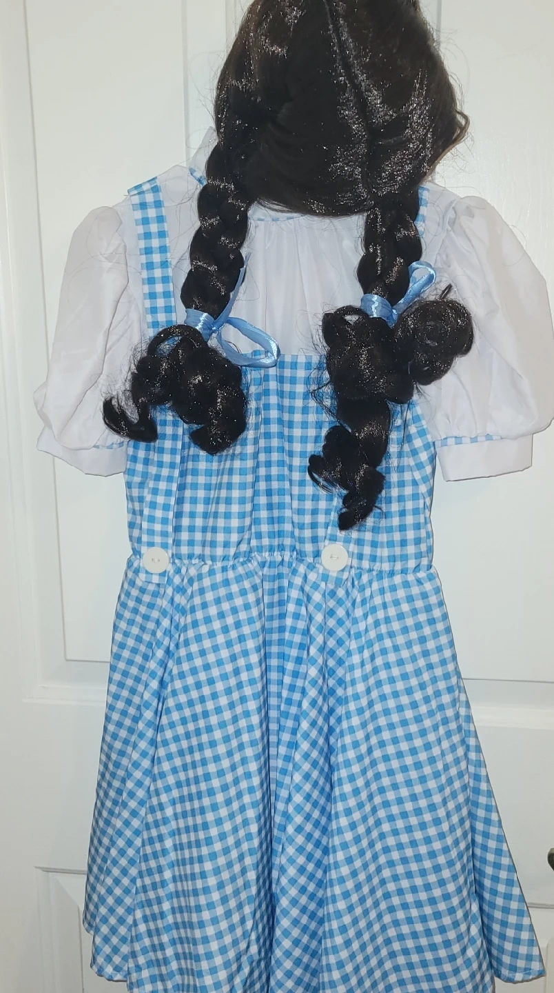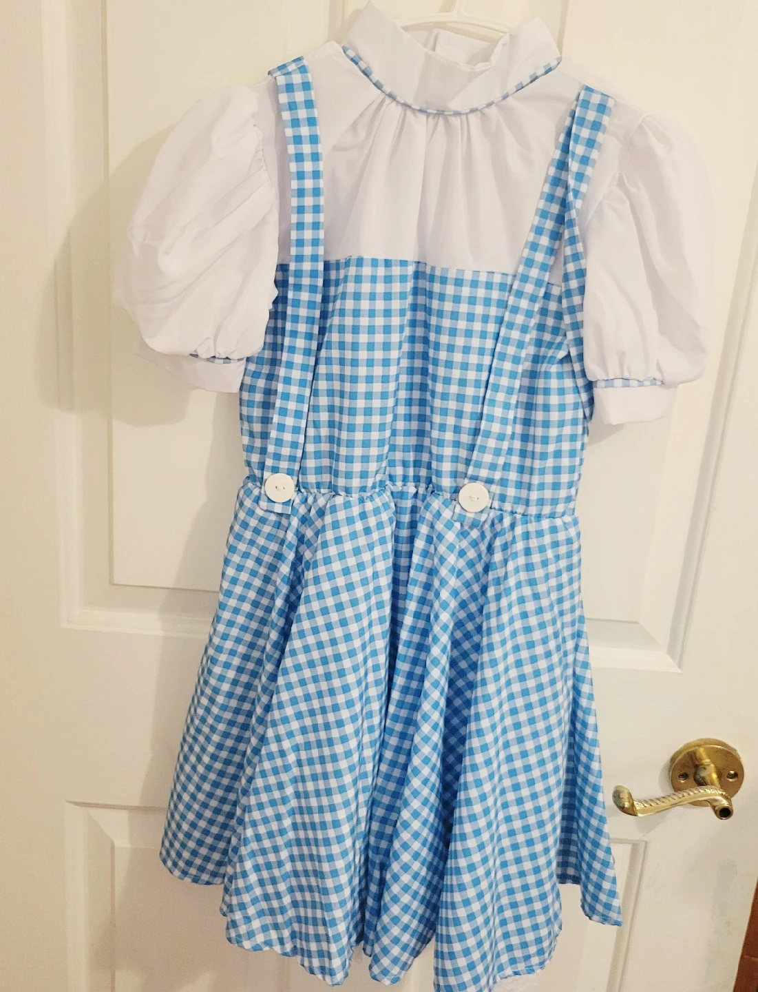 30Selling a used Dorothy costume from the Wizard of Oz! It's a cute blue and white gingham dress with a white top and puffy sleeves and Braided wig. Perfect for Halloween or dress-up! Child size 6-8
