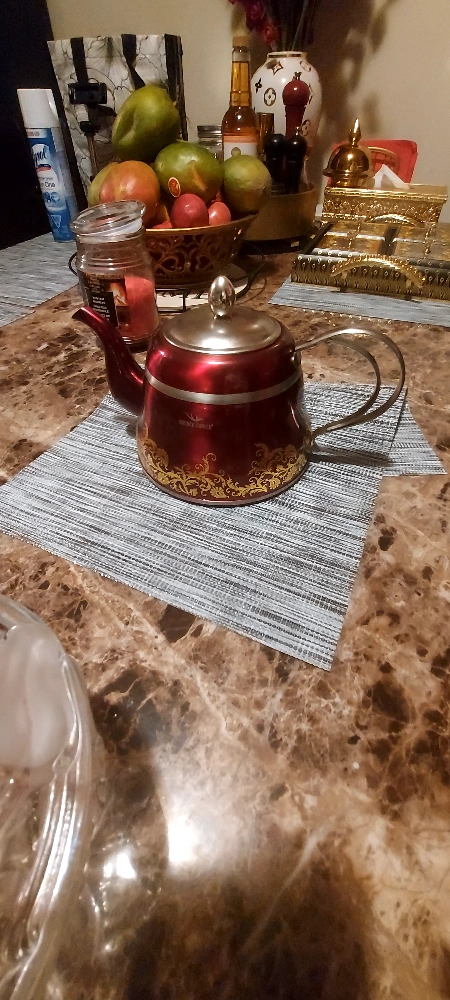 Beautiful teapot, red with gold detailing. Features a built-in infuser. Stainless steel construction. Perfect for tea lovers.