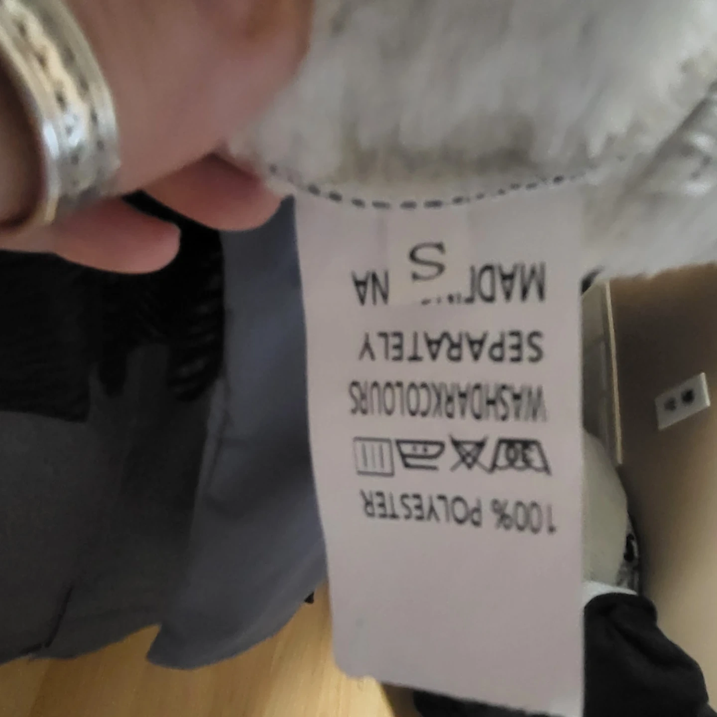 Selling a blue hooded jacket. It's a size small and made of 100% polyester. Wash dark colours separately!