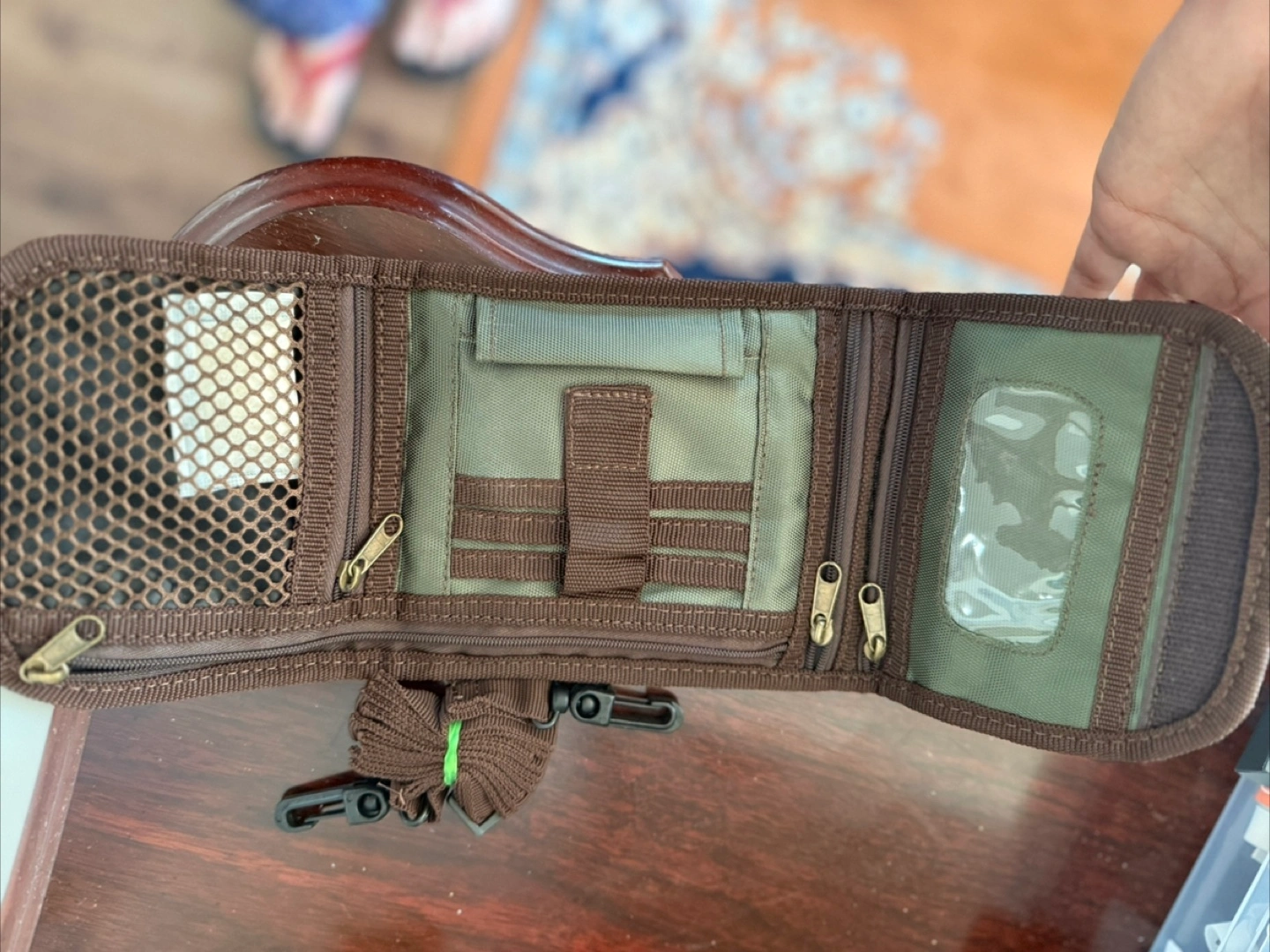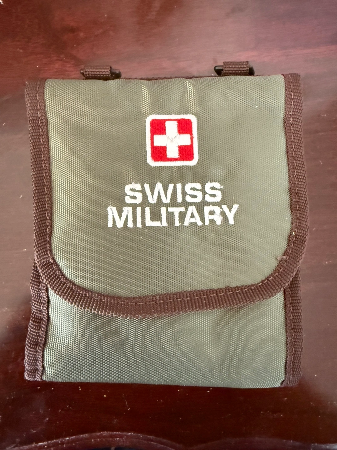 Compact and durable Swiss Military branded travel wallet/organizer. Made with sturdy olive-green and brown nylon, perfect for carrying essentials during trips or outdoor activities. Includes multiple zippered compartments, mesh pocket, card slots, and transparent ID window. Folds neatly with secure velcro closure and hanging hooks. Ideal for organizing passports, IDs, cash, cables, or small tools.