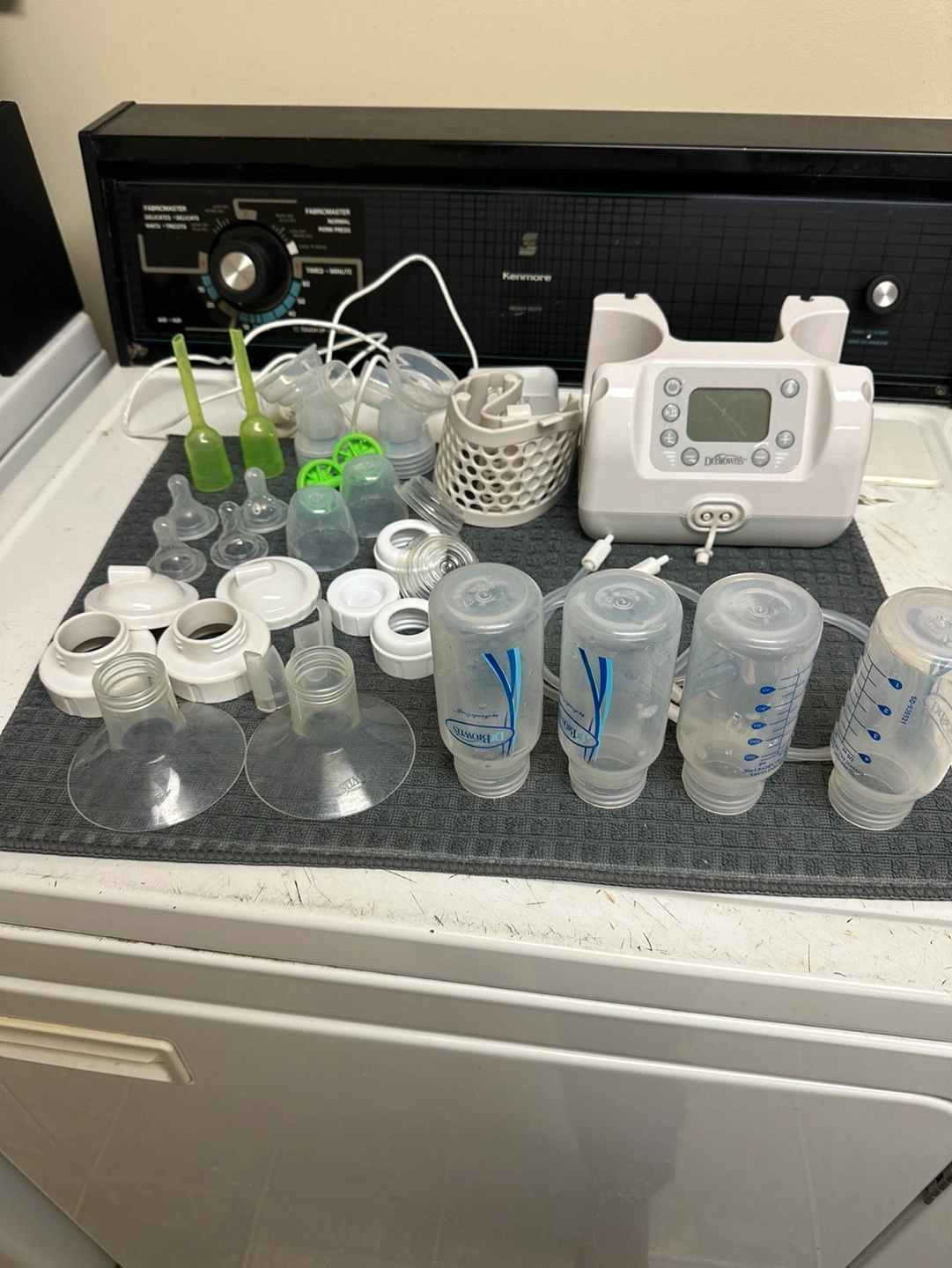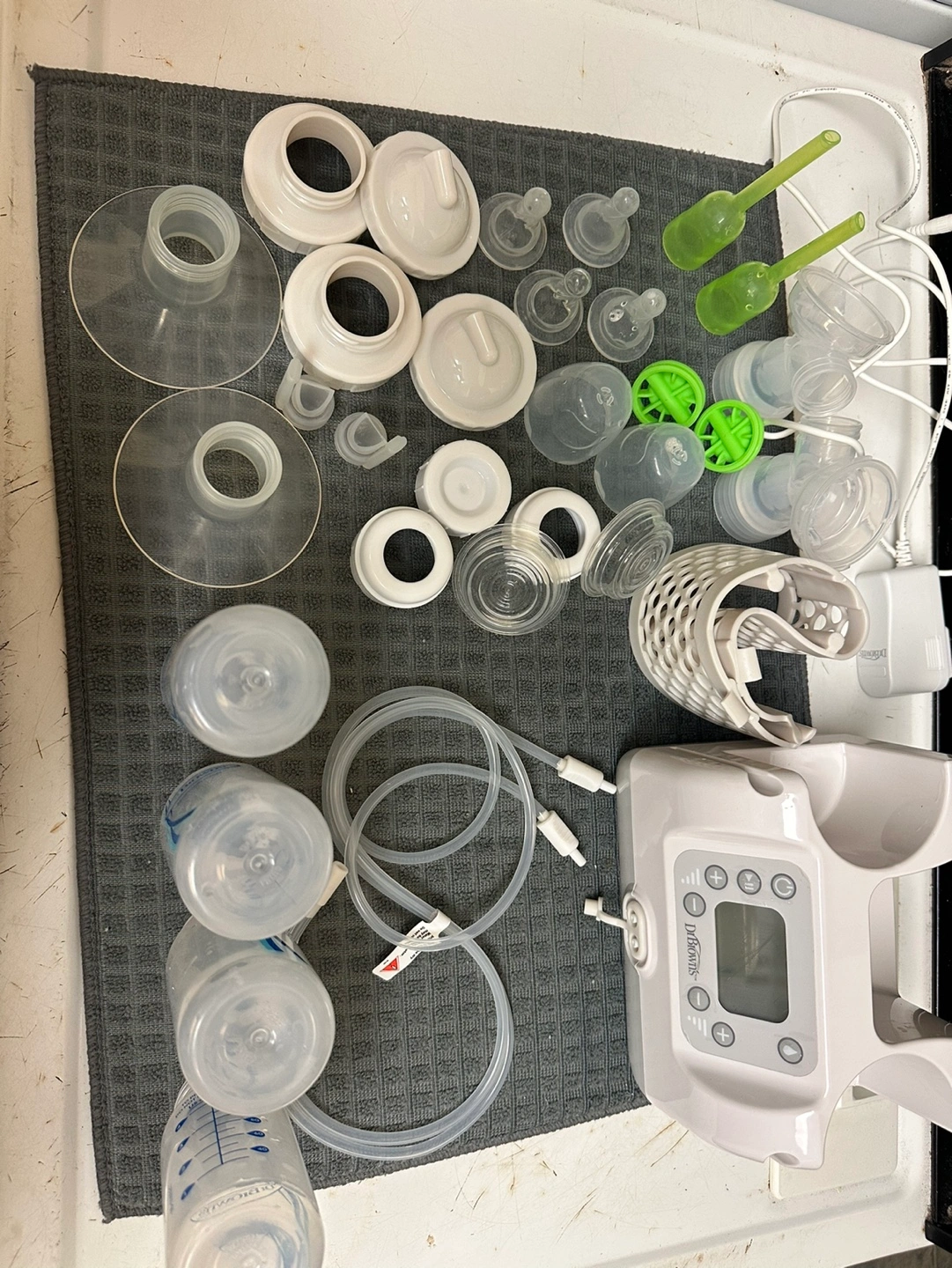 10Double electric breast pump, includes bottles, tubing, flanges, and various other accessories. Comes with power adapter.