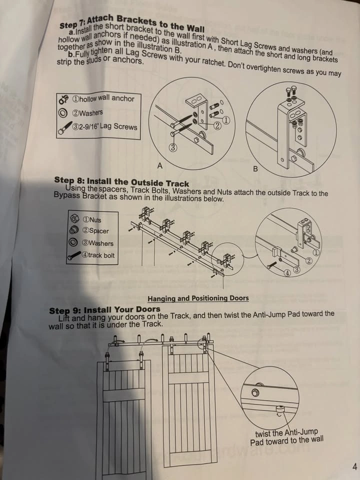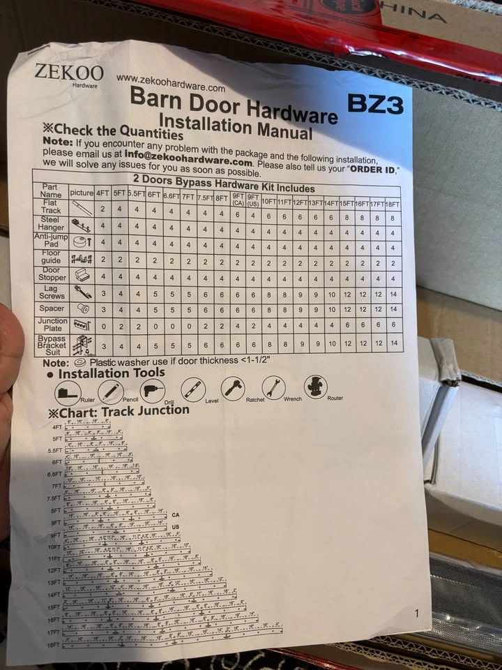 Heavy-Duty 6ft + 6.6ft Double Track Barn Door Hardware Kit. New and sealed. Pickup in Barrhaven, Mountshannon and Daventry street intersection. Total track length: 6 ft + 6.6 ft Ceiling mounted, low clearance design (requires 9" from door top to ceiling) Supports barn doors up to 230 lbs High-quality carbon steel with black frosted finish Smooth and quiet sliding with Gcr15 bearing steel rollers Includes 4 rails, 4 rollers, 5 brackets, 4 door stops, 4 anti-jump pads, 10 spacers, 2 pair floor guides, installation manual Fits door thickness 1-3/8" to 1-3/4" Suitable for closets, interior doors, exterior doors, and bypass sliding doors