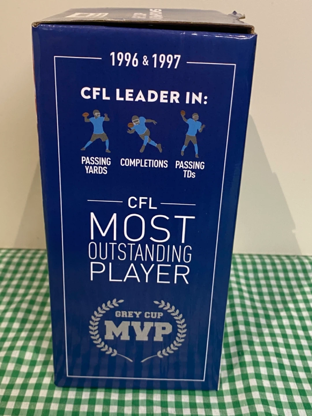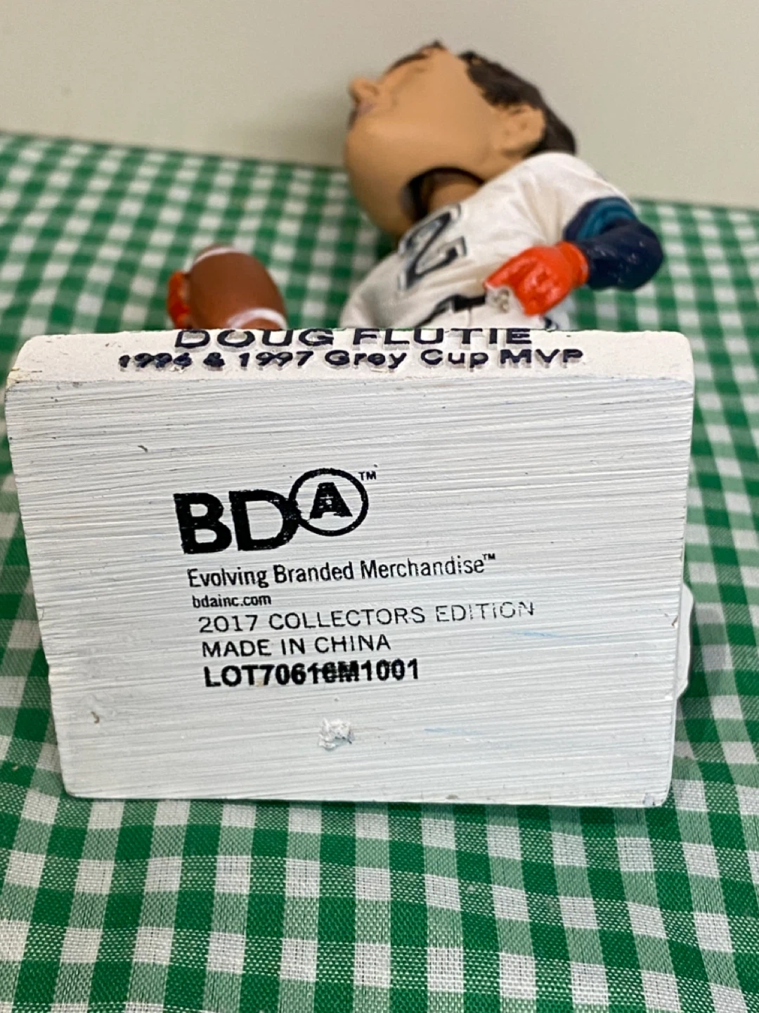 Selling a Doug Flutie bobblehead figure. It's a 2017 Collector's Edition from BDA Evolving Branded Merchandise. The base commemorates his 1996 & 1997 Grey Cup MVP awards. Brand new, in original packaging, only removed for pictures. Pickup only, Kipling and Highway 7 area of Woodbridge.