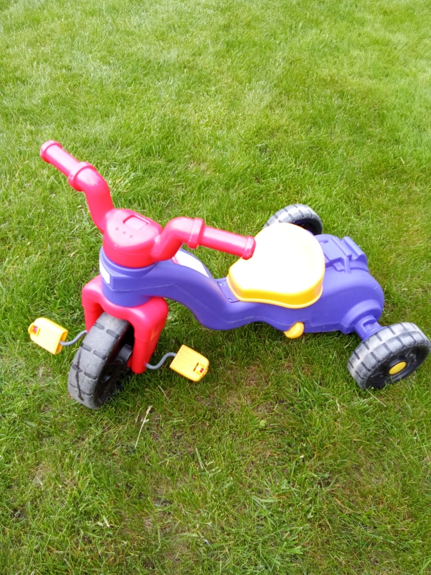 A bright and colourful tricycle. Constructed of plastic in shades of purple, red, and yellow. The tricycle has three wheels. A wonderful item to get some fresh air.