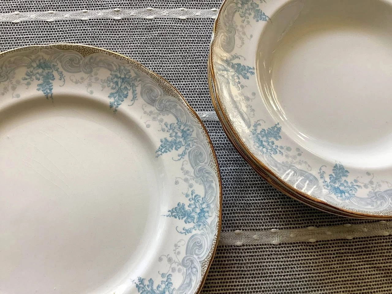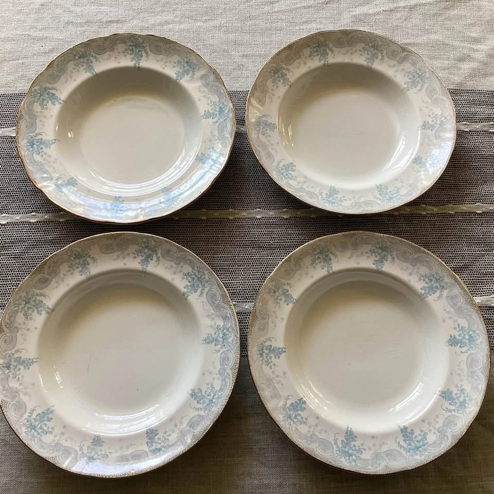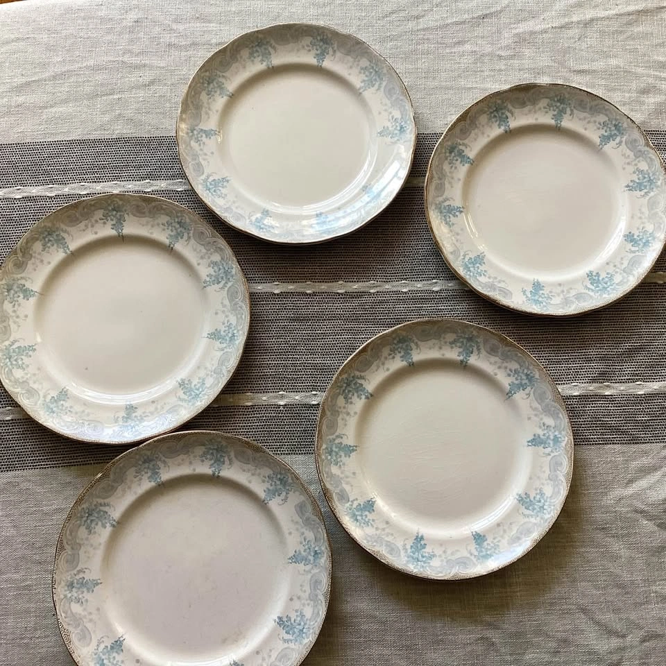 213Beautiful set of 9 pieces of antique English china by Doulton Burslem, in the Laburnum pattern (Rd No. 330852, c.1891–1901). (Doulton Burslem dates prior to them becoming known as Royal Doulton) Includes 5 dinner plates and 4 soup bowls. Lovely light blue floral and scroll design with original gold edging. No chips or cracks — They do have age-related crazing and marks as shown in the photos/video, as expected for 120+ year old china. A charming example of late Victorian Doulton craftsmanship — perfect for display for collectors or light use. 💰 $120 cash only. 📍Pickup in Toronto near Parliament and Bloor