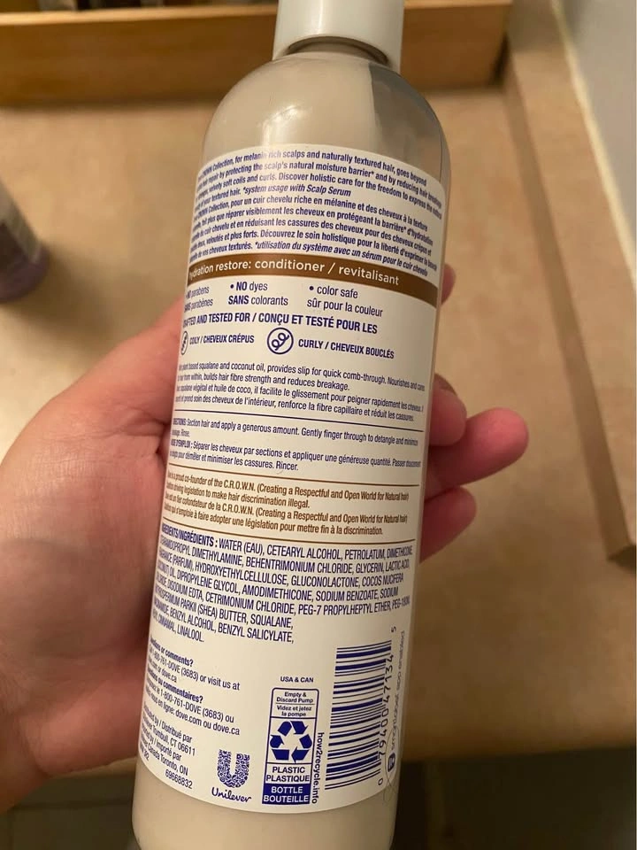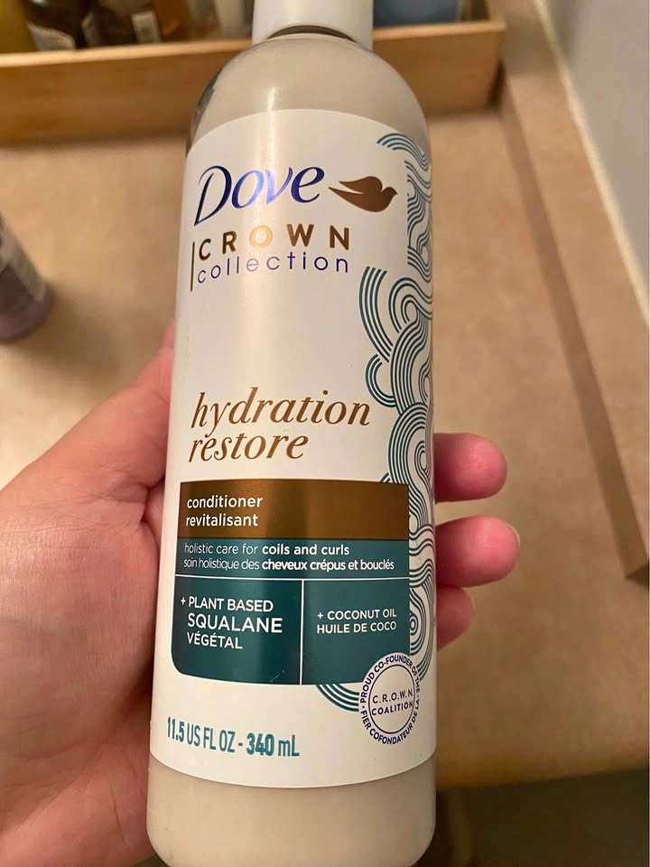 15Never used, not even opened, bought it by mistake thinking it’s a leave-in conditioner. Dove conditioner 340ml. CROWN collection - hydration restore conditioner for coils and curls.