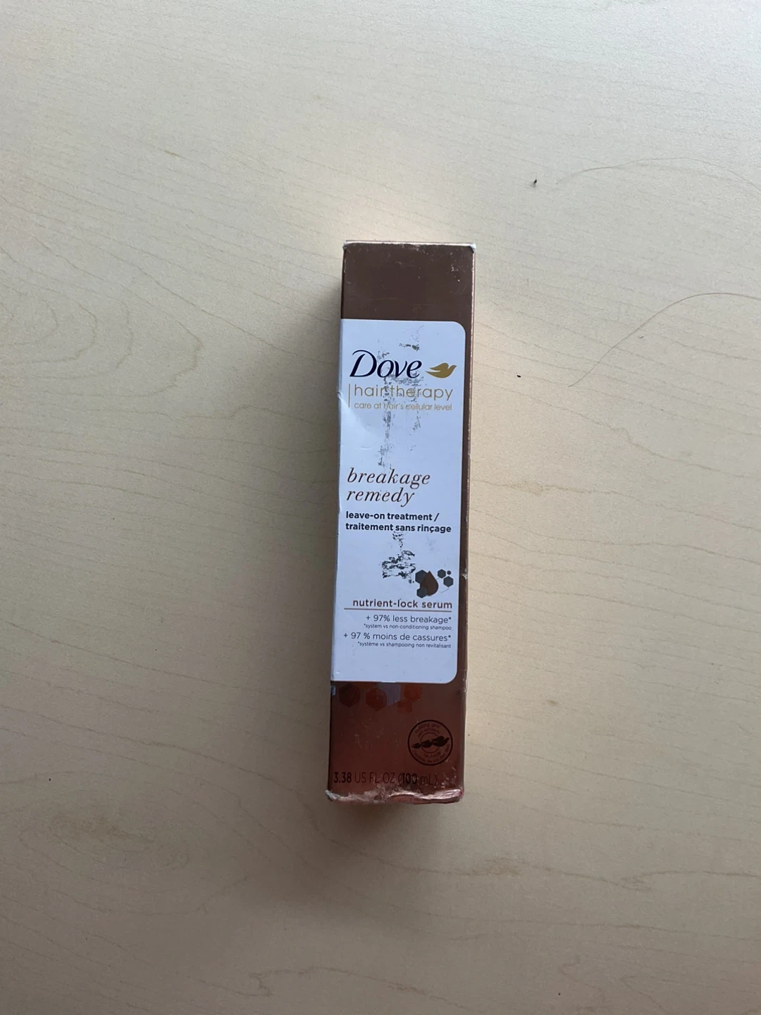 5Selling a bottle of Dove Hair Therapy Breakage Remedy leave-on treatment. This nutrient-lock serum helps with 97% less breakage. It comes in a 3.38 US fl oz (100 mL) bottle