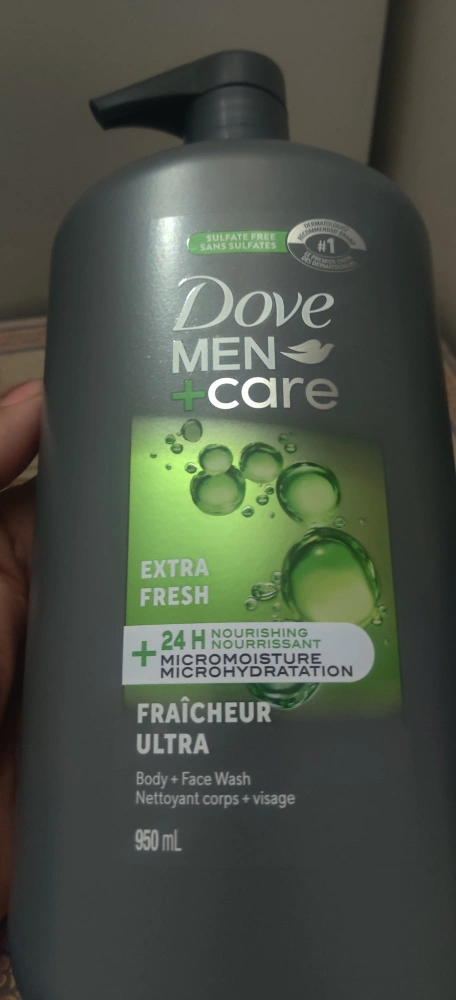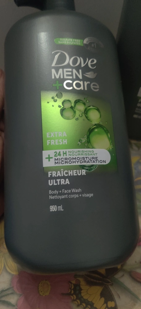 Selling 2 bottles of Dove Men+Care Extra Fresh body and face wash. This is the ultra fraicheur version in a 950ml bottle. It's designed to provide 24-hour nourishment and micro-moisture hydration. Perfect for a refreshing shower experience!