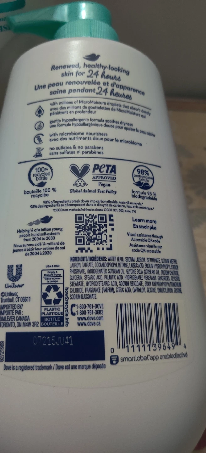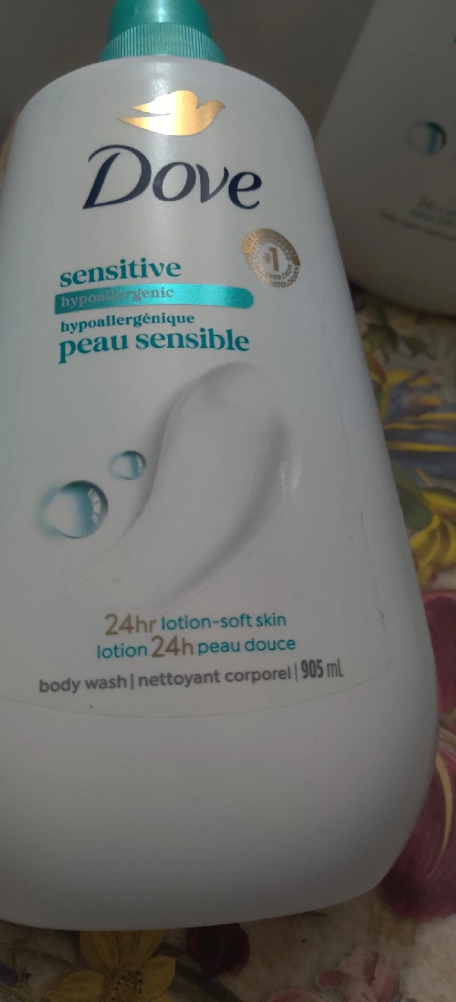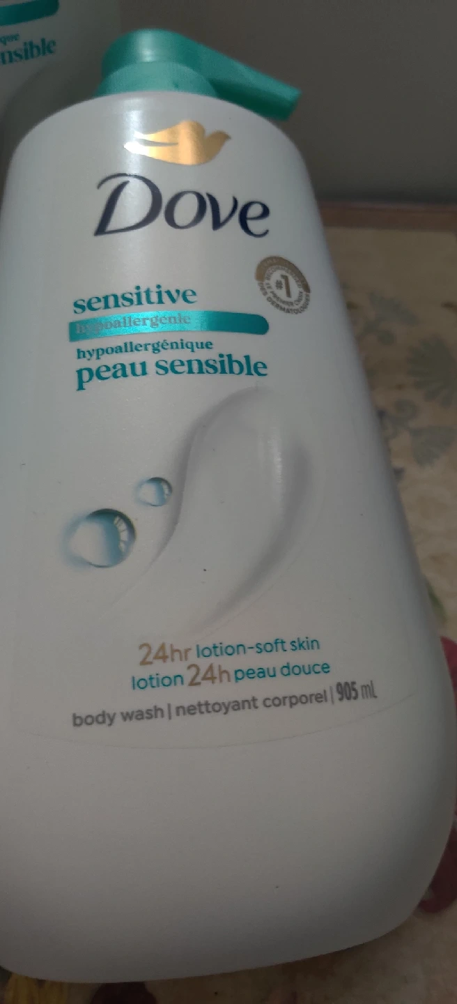 1000+Selling two bottles of Dove Sensitive body wash. Each bottle contains 905 mL of lotion-soft skin body wash. Gentle hypoallergenic formula soothes dryness. 24hr lotion-soft skin