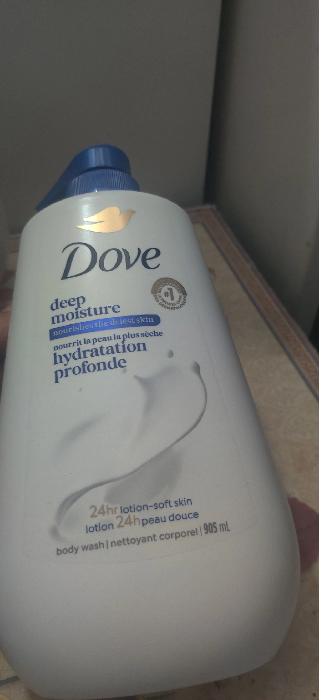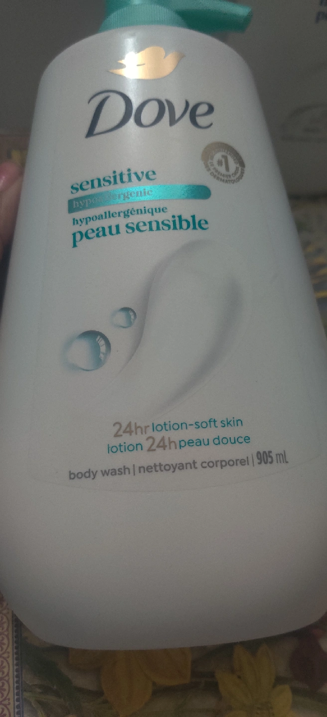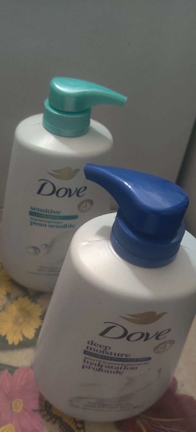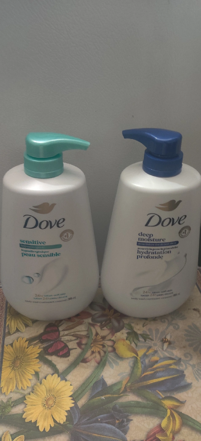 Selling two bottles of Dove body wash! One is the Sensitive hypoallergenic formula, and the other is Deep Moisture. Both are 905 mL bottles, perfect for keeping your skin feeling soft and hydrated. They provide 24-hour lotion-soft skin