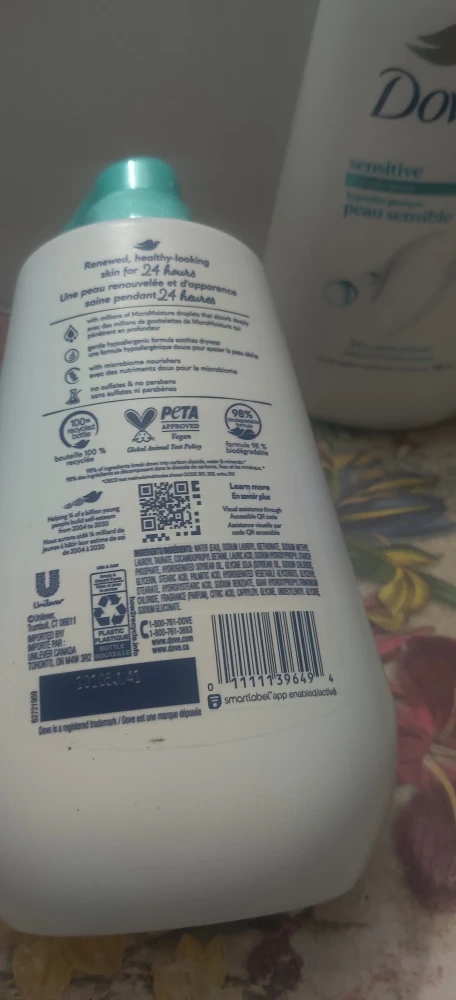 1000+Selling two bottles of Dove Sensitive Skin body wash. Each bottle contains 905 mL of body wash. They are perfect for sensitive skin and provide 24-hour lotion-soft skin