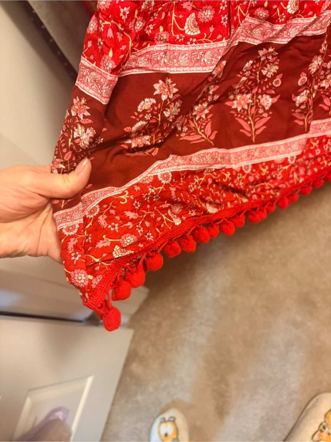 This red boho-style dress features a vibrant floral print with a tie neckline and a playful pom-pom trim. It's made of lightweight fabric, perfect for warm weather. This dress would be a lovely addition to a summer wardrobe!