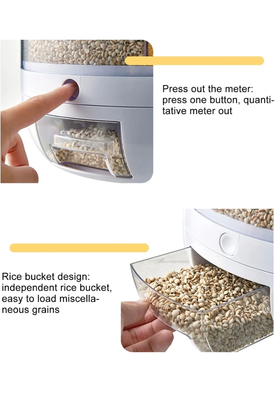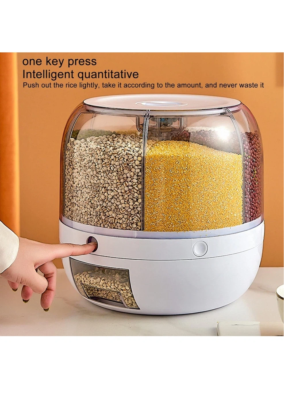 This 11lb rotating grain dispenser has 6 grids for storing different dry foods. It features intelligent quantitative dispensing with just one key press. The rice bucket design makes it easy to load miscellaneous grains.