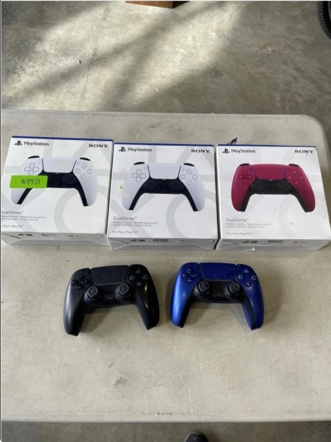 Includes two white, one pink, one black, and one blue DualSense wireless controllers for PS5. Some controllers are in original packaging.60$ for each