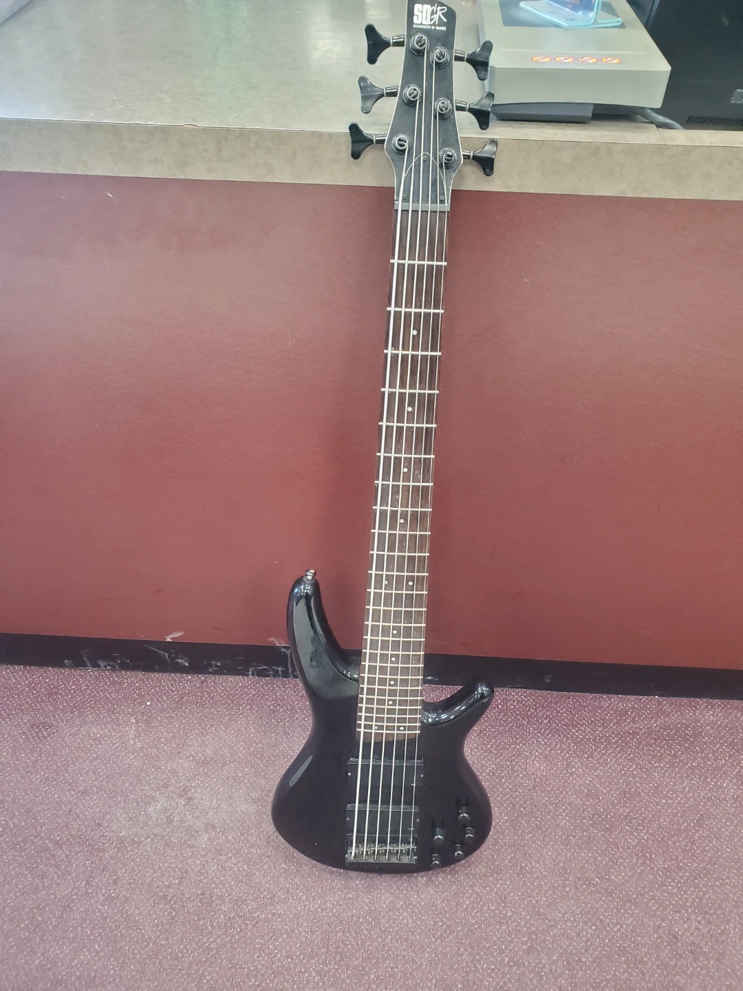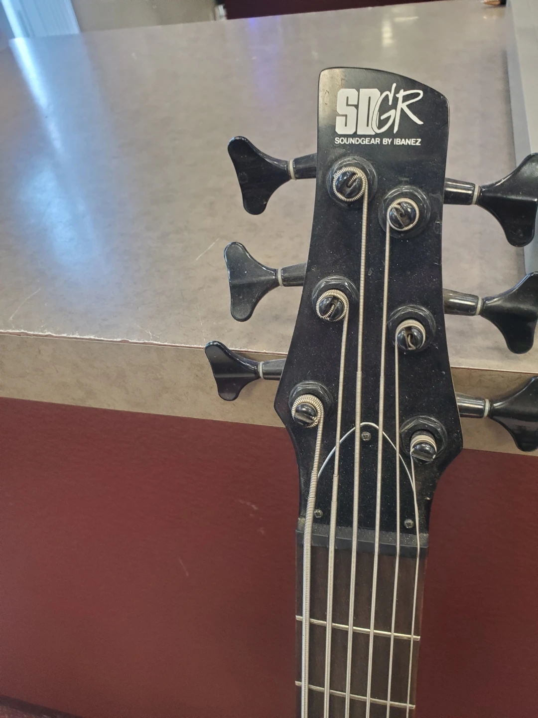 This is a black Ibanez Soundgear bass guitar. It's a 5-string model. This bass would be great for musicians looking for extended range.