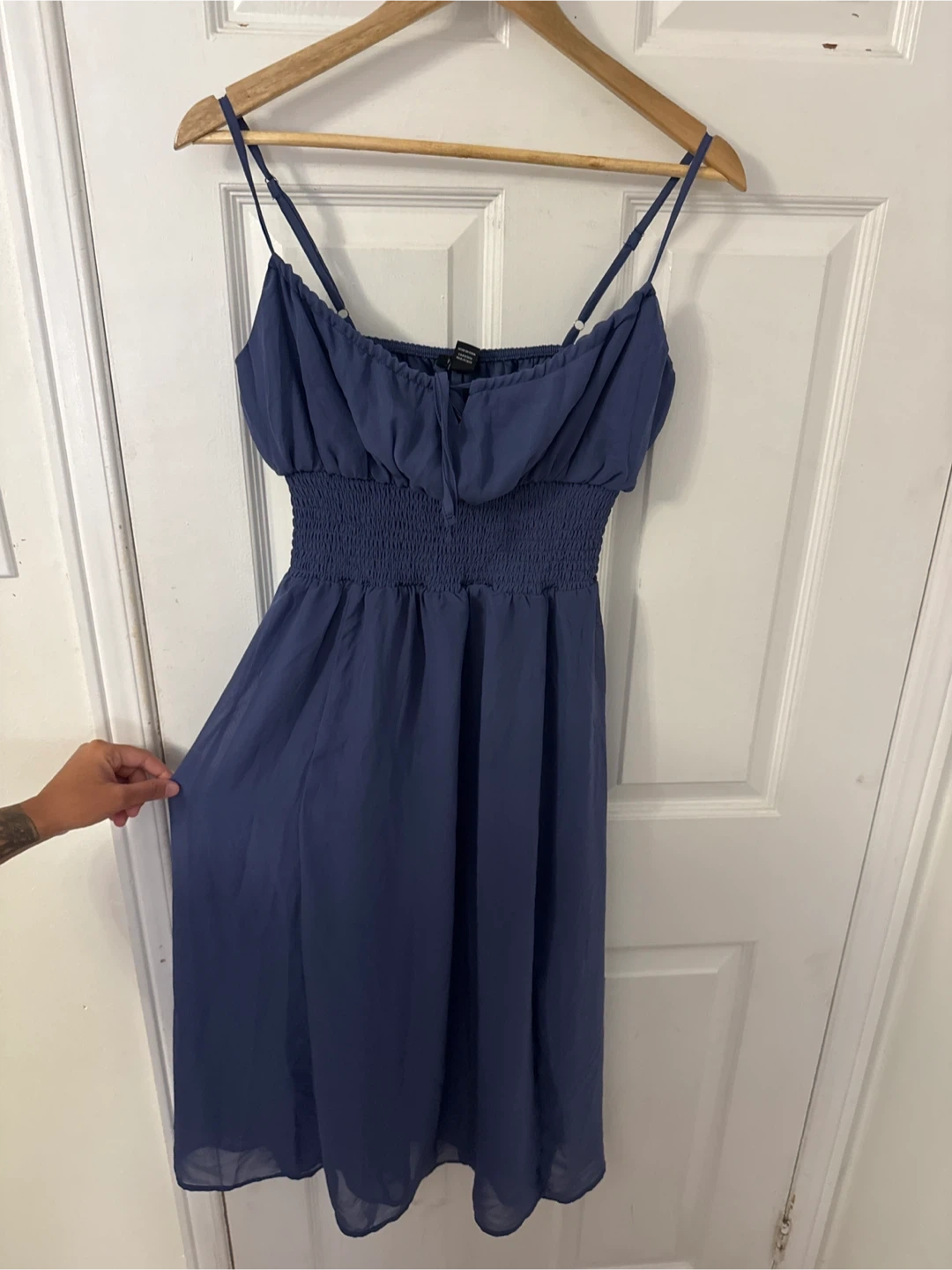 Charming blue sundress from Forever 21. It features a smocked waist and bodice with adjustable spaghetti straps. Made of lightweight fabric, it's perfect for warmer days!