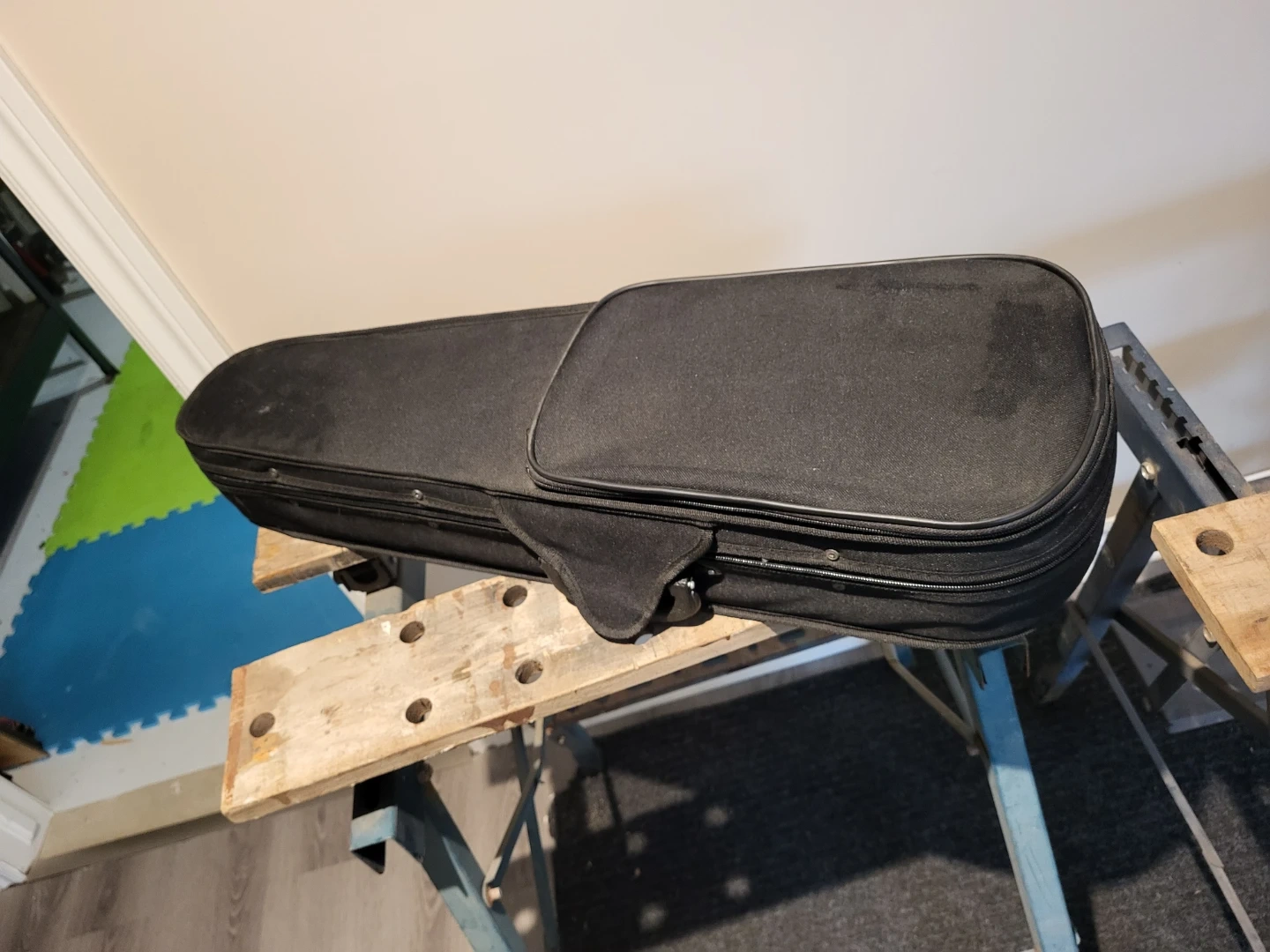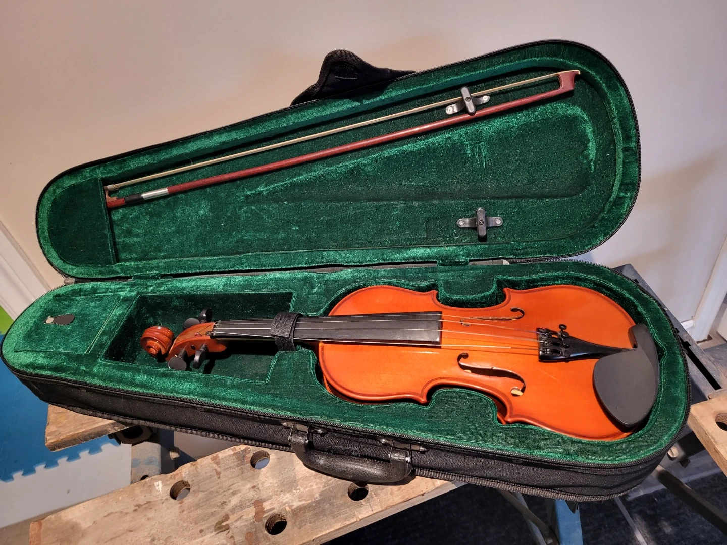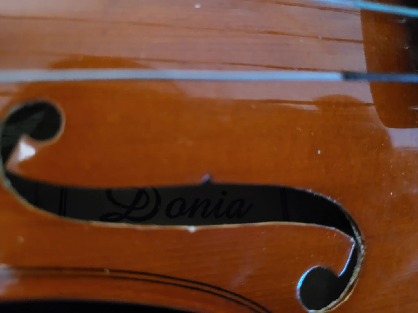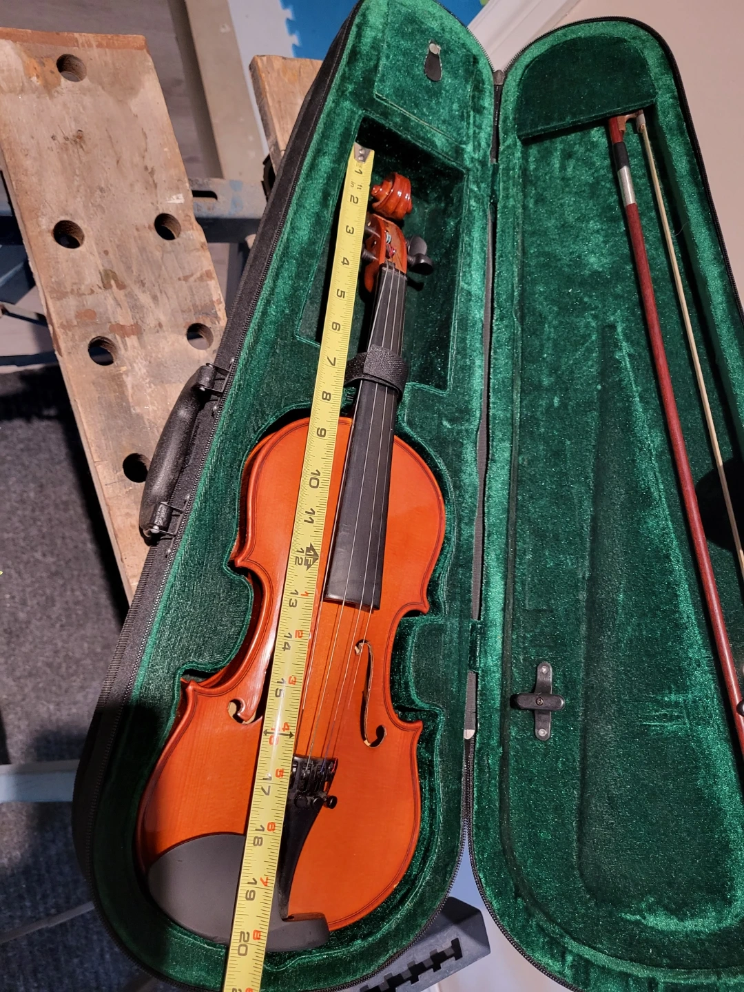 This is a Donia violin in a black case with a bow. It measures approximately 20.5 inches in length. The violin has a warm wood finish. Includes a small compartment in the case for accessories. I dont know much about violins, so sold as is.